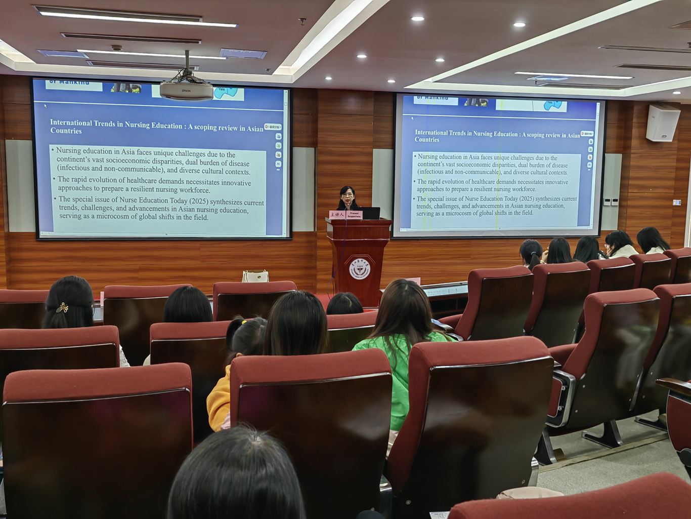 Praneed Songwathana从亚洲护理教育面临的挑战出发,指出护理教育在数字化时代需要不断适应全球变化。她强调,为了应对这些挑战,护理教育必须不断创新,采用混合式学习、虚拟现实模拟以及跨学科合作等创新教学方法,提升学生的参与度和专业技能。她还分享了泰国宋卡王子大学在护理教育方面的经验及做法,介绍了该校全面发展学生能力的教育理念,强调终身学习和以学生为中心的教学方法,及反思性学习和写学习日志等方法对学生发展判断力、个人价值观和批判性思维能力的作用。在交流环节,大家积极互动,围绕如何平衡AI与传统护理教育、AI如何应用于护理教育、如何将国际上新的教育方式与当地教育环境相结合等问题展开了热烈讨论。Praneed Songwathana特别提到,AI等技术工具在护理教育中的应用展现出巨大潜力,但也需要关注其伦理和实施层面的挑战。