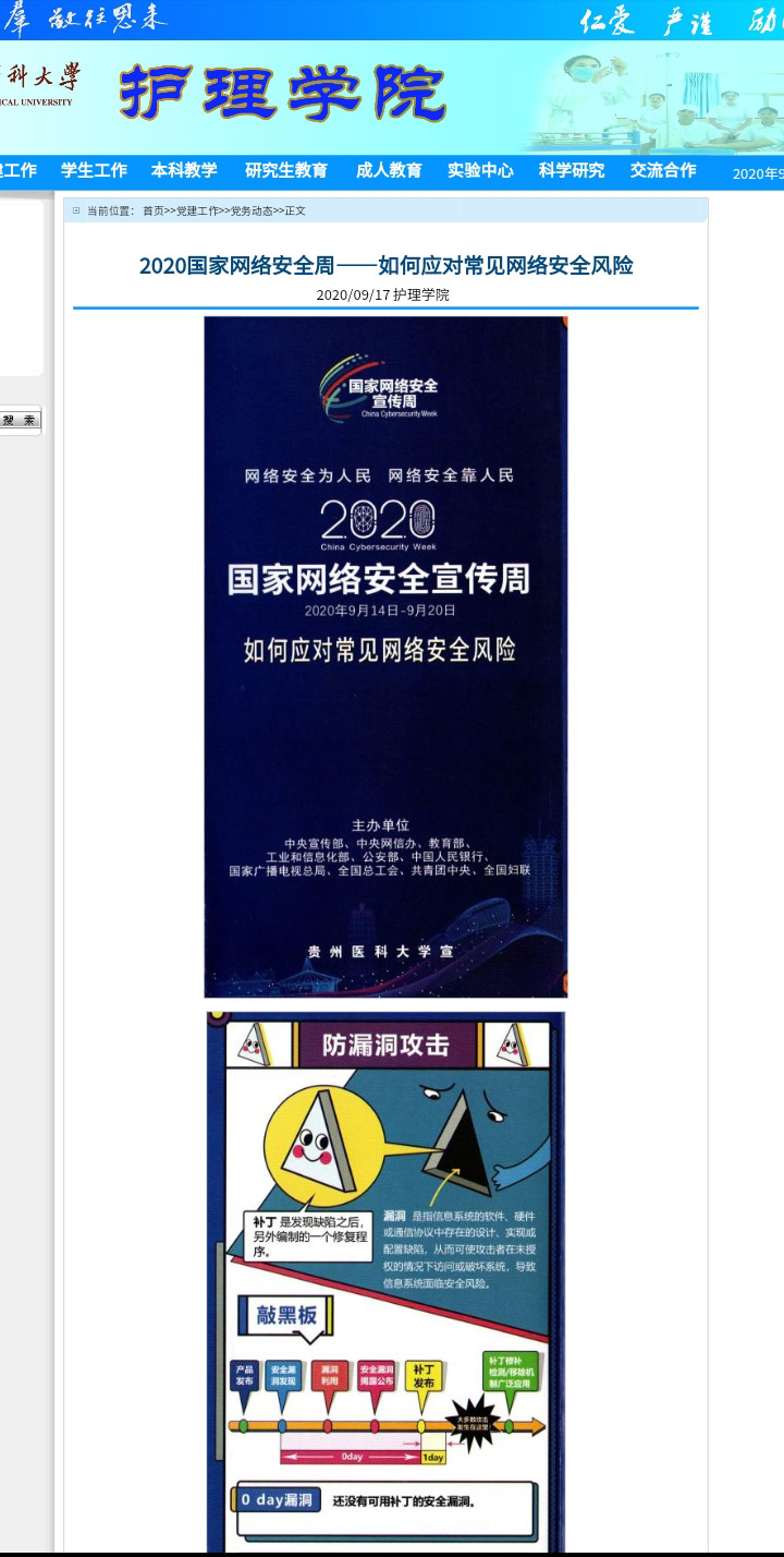 学院派专人领取了学校印制的《如何应对常见网络安全风险》宣传折页,在教职员工生中进行了发放,要求大家传阅学习。同时在微信公众号上对网络安全宣传内容进行了推送,老师们也积极进行了转发,有效扩大了宣传的覆盖面。