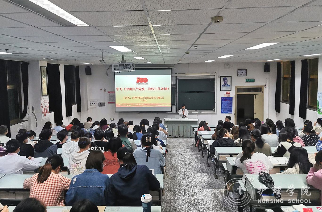 10月12日,永利集团304官方入口于北校区3101教室通过线上线下相结合的方式组织全体教师、教职工党员、学生党员及入党积极分子学习《中国共产党统一战线工作条例》,永利集团304官方入口正科级组织员曾敏主持,学院党委统战委员、副院长王秀红领学。