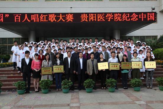 为隆重庆祝中国共产党建党90周年,重温党的光辉历程,歌颂党的伟大成就,进一步深入开展创先争优活动,唱响红色时代主旋律,展现青年大学生朝气蓬勃的精神风貌,由学工部、学生处主办的“贵阳医学院庆祝中国共产党建党90周年‘歌唱祖国 唱响校园’百人合唱比赛”于5月25日在学校广场隆重举行。