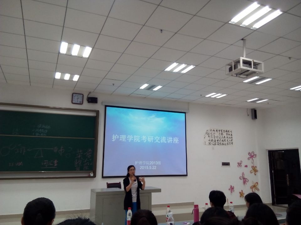 首先,研究生姚欢与同学们分享了考研的路程,并就可能影响在读大学生考研的几个因素作了详细讲述。研究生王先美则着重从护理专业的就业状况、考研科目、能否跨专业考研等方面展开讲述,为同学们讲述了目前贵州省医院招收护理人员的标准,指出研究生与本科生在工作上有一定差距。接着,研究生曾雯结合自己考研学习的经验与在场的同学进行了交流,她用自己的经历告诉同学们在学习中要给自己树立目标,在面试中勇于把自己的闪光点表现出来,给自己加分。最后,同学们积极就自己在考研方面存在的困惑提出疑问,研究生师姐热情与同学们进行交流,一一解答了同学们的疑惑。此次考研交流讲座在热烈的掌声中圆满结束。