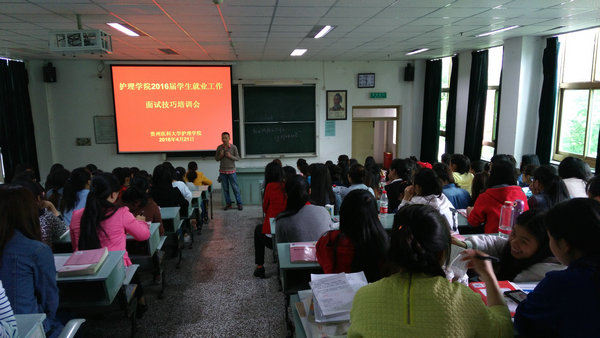 陈科长提到今年贵医附院有一个很好的政策优势,附属医院将对外招护理专业的编制人员。同时,随着附院新外科大楼的修建并投入使用,新增床位将近800张,这对护理专业毕业生来说无疑是一个很好的契机。接着陈老师为大家讲解了参加单位面试的注意事项,面试着装需简洁大方、干净清爽,言语表达流利,自信与微笑等在面试当中尤为重要,并提醒同学们在公立医院改革即将到来之际,需不断提升自己的专业素质以更好的应对。最后陈科长就同学们对考试的一些疑问做了详尽的回答。