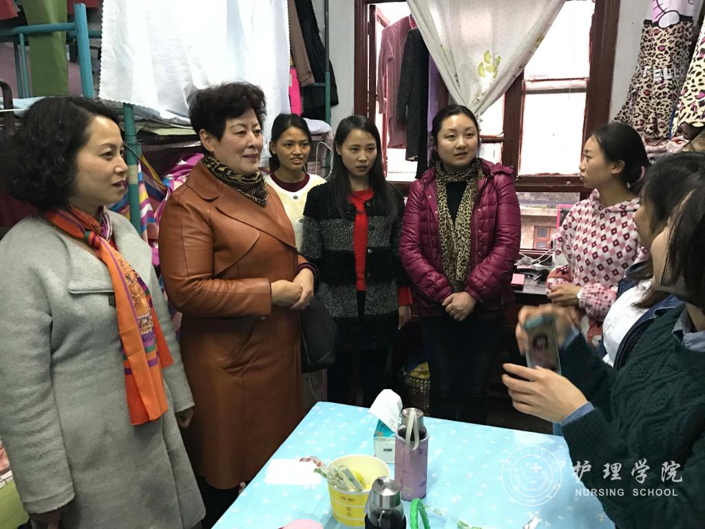 贾秀英询问了学生的学习生活情况,提醒学生注意寝室卫生,保持宿舍空气清新,开窗通风,鼓励同学们积极参加校运会选拔,加强体育锻炼,积极预防疾病发生;杨英叮嘱同学们注意保证好用电安全,以及财物和人身安全。