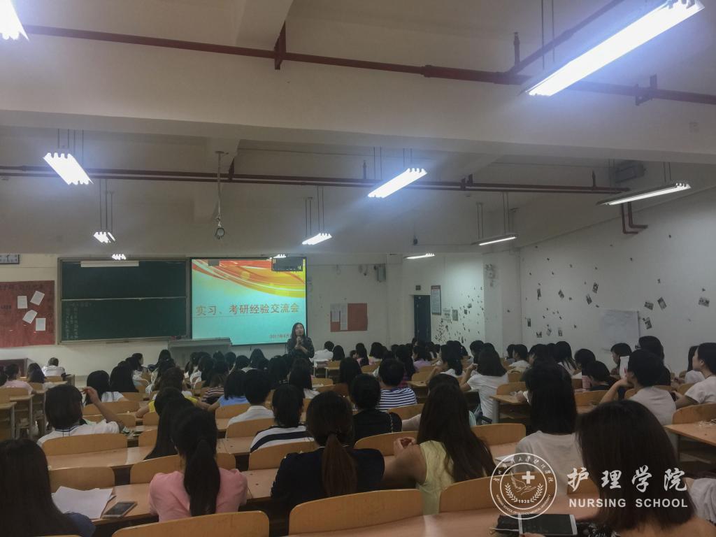 交流会主要分为三个部分,第一部分主要针对不同医院实习的同学,曾在附属医院、六盘水市人民医院、苏州九龙医院、四川德阳市人民医院实习的毕业生代表,结合自身情况分享各个实习医院的环境和要求,帮助大家初步熟悉实习地点情况、尽早进入实习状态;第二部分,龙婷婷同学结合自己考研的实际,给学弟学妹们介绍了考研过程中有关学校选择、专业选择、面试准备等相关问题。其中特别提出要注意对目标学校的教授进行了解,可以通过关注目标学校的网站,还可以下载教授的相关论文熟悉其科研状况;第三部分,提问环节中,学姐们认真、细致地解答了同学们对于实习和备战考研过程中的各种疑惑,并给出了相关建议,让在座的同学在愉悦的氛围中受益匪浅;最后,辅导员李颖老师对此次交流会进行了总结。鼓励大家珍惜实习带来的宝贵实践经历,不断提高自身综合素质,用努力和行动,迎接明天的成功。近两个小时的交流会在同学们热烈的掌声中结束。