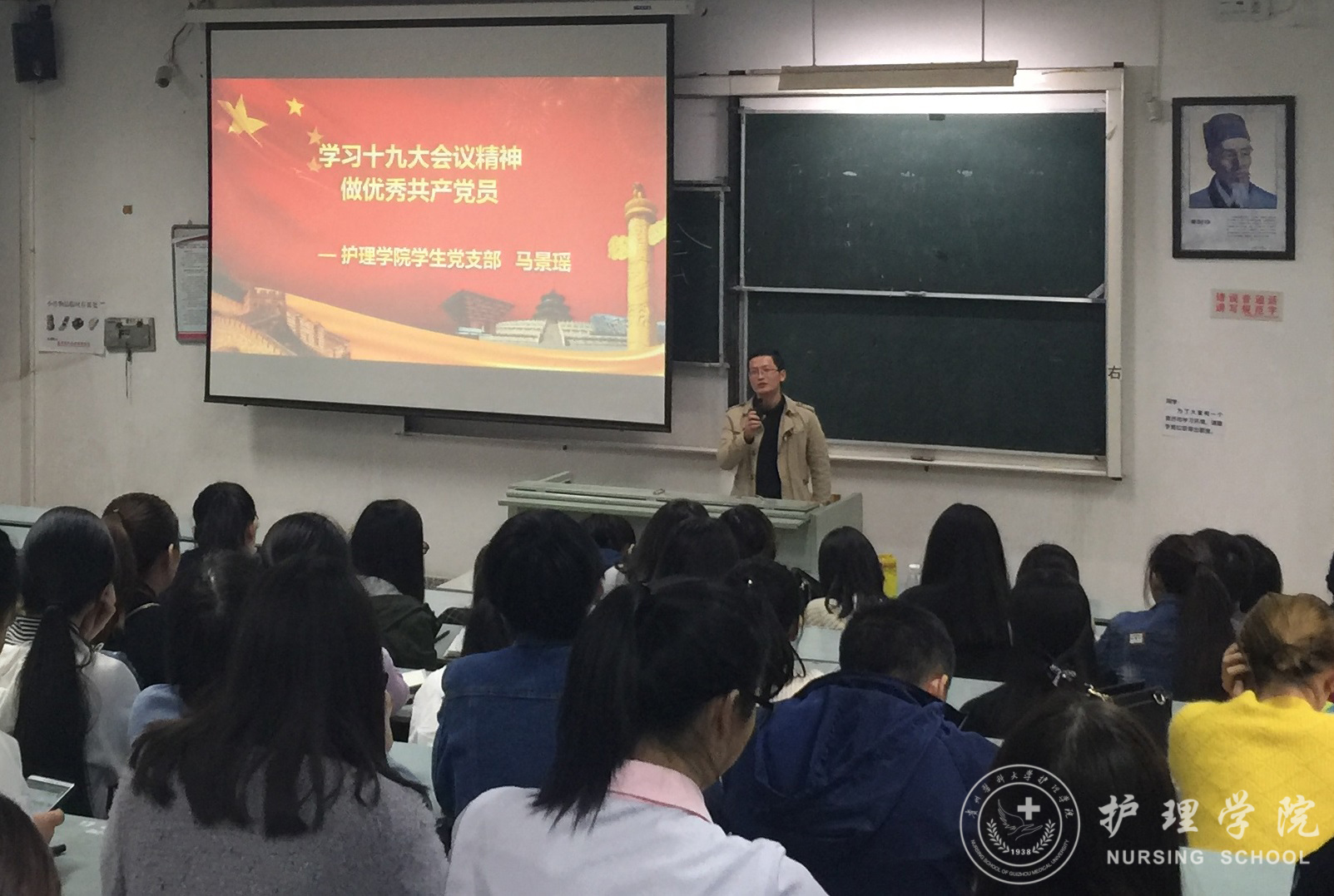 马景瑶从中国近现代史谈起,深刻阐述了“新时代”的伟大的历史内涵和现实意义。介绍了十九大报告、主题、意义和十九次党代会选举产生的新一届中央委员会委员、中央纪律检查委员会委员,解读了新时代中国共产党的历史使命。并激励全体学生党员在实现中华民族伟大复兴历程中建功立业,担负当代青年人的重大历史使命。