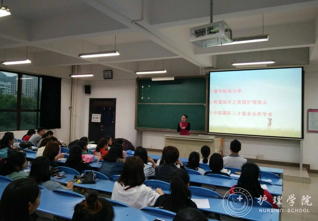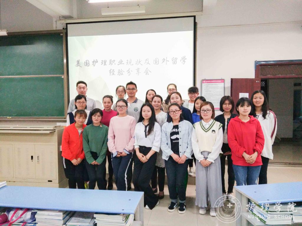 2018年5月31日下午7:00,永利集团304官方入口于北校区2401教室召开了“美国护理职业现状及国外留学经验分享会”,分享会邀请到美国海格斯大学出国留学区域负责人彭冰老师为永利学生进行了交流指导,永利集团304官方入口党委副书记杨英、护理技能实验室主任周谊霞、学生科科长曾敏、辅导员李杏春和2014、2015级部分同学参加了此次交流会。会议由周谊霞老师主持。