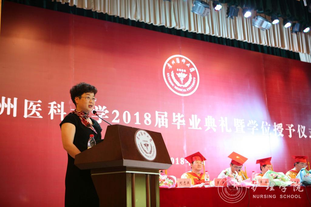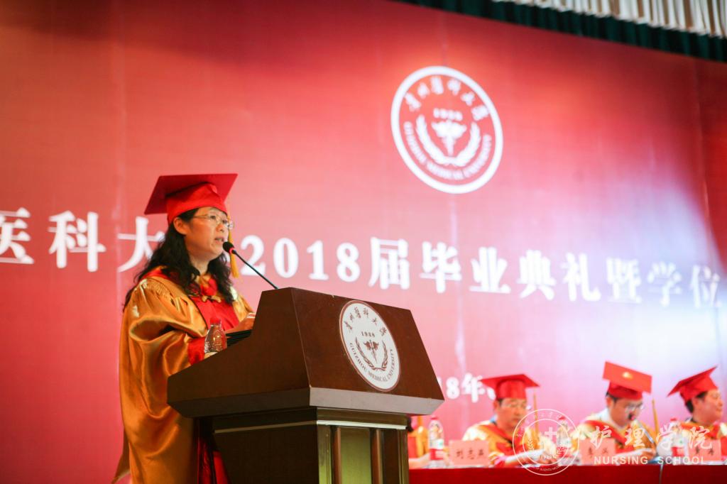 随后,毕业生代表向领导及教师代表献花;教师代表医学检验学院莫菲教授发言;优秀校友钱兰芳发言;护理学专业本科毕业生代表喻婷发言。