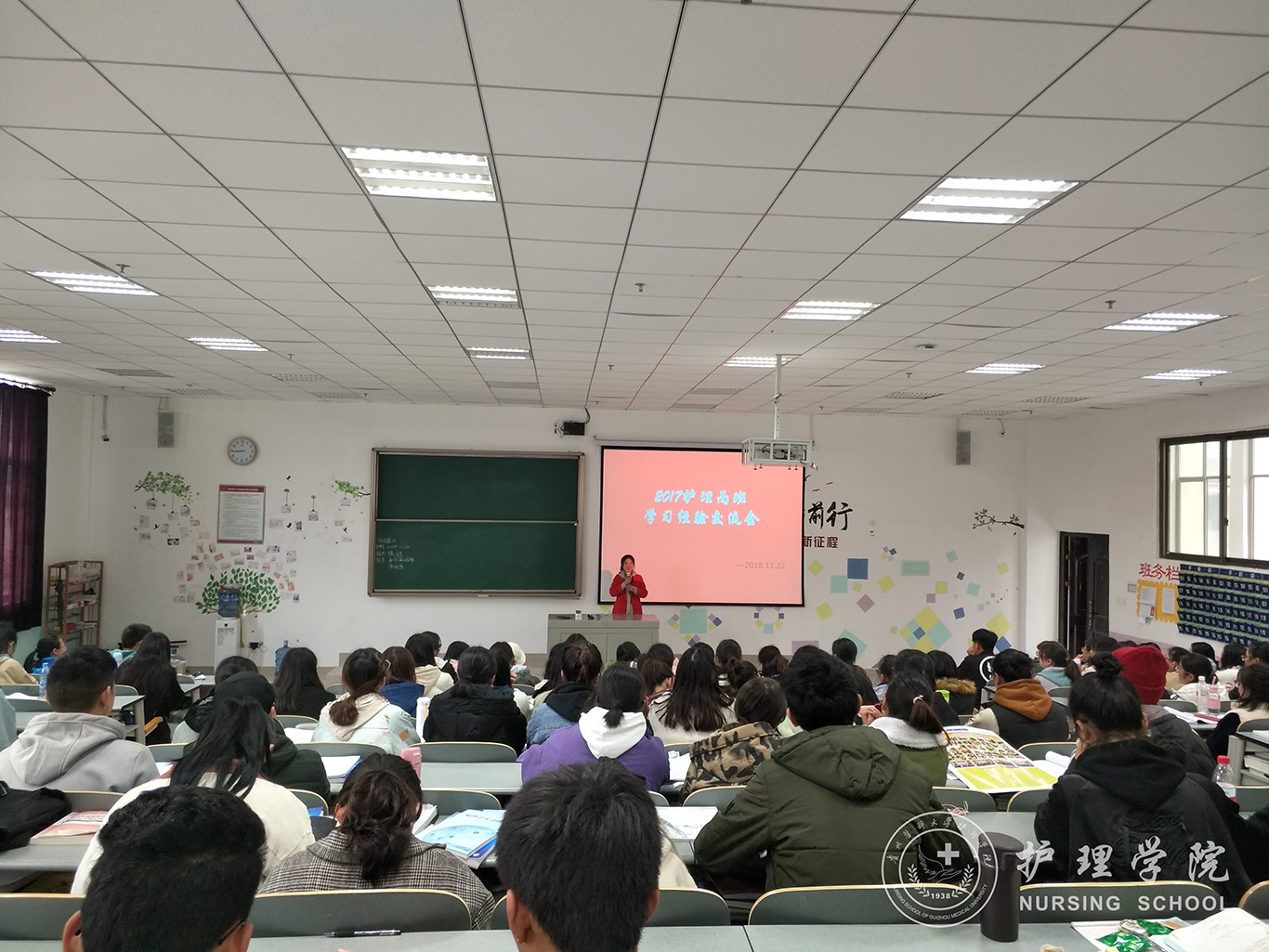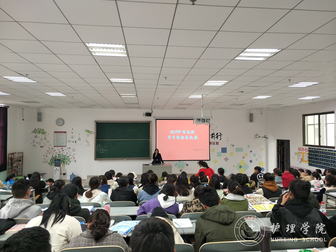 11月22日下午,永利集团304官方入口分别在南校区7405、1302教室开展学习经验交流主题班会,本次班会邀请2015级护理学专业王洁、高汝琪两位同学主讲,辅导员王晓玲老师和班主任李宇老师、罗晶老师以及护理学2017级丙班和2018级丙班全体同学参会。