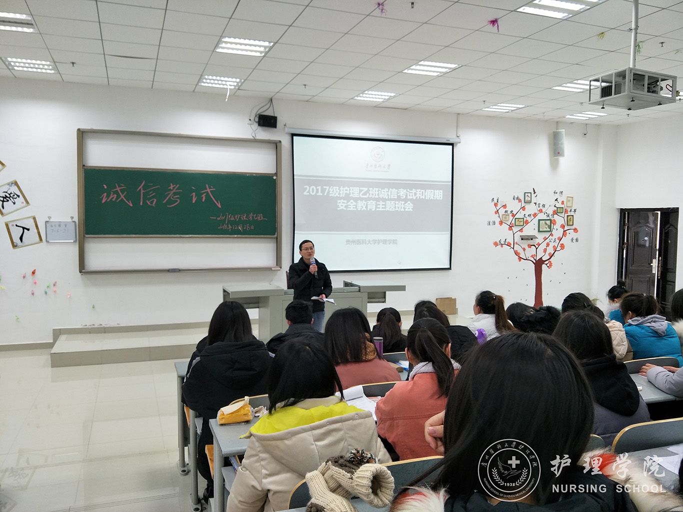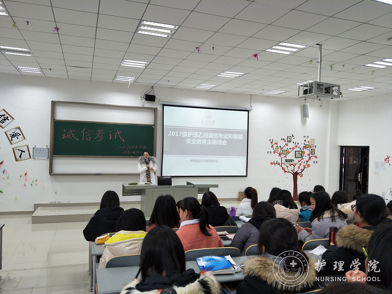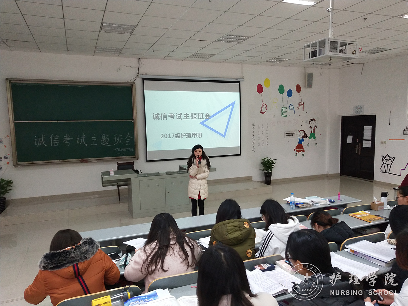 12月28日下午,永利集团304官方入口在南校区7404和7406教室开展诚信考试主题班会。班会由2017级护理甲班、乙班两班班长主持,班主任吴俊、王丽和辅导员马景瑶主讲,全体同学参加。