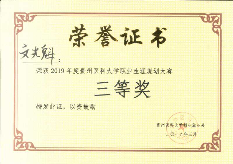 3月27日,由我校招生就业处主办、临床医学院与口腔医学院共同承办的304永利集团登录入口“职上云霄,梦想引航”大学生职业生涯规划大赛在南校区道德讲堂举行。永利护理学2016级甲班的文光魁同学获得了三等奖的好成绩。