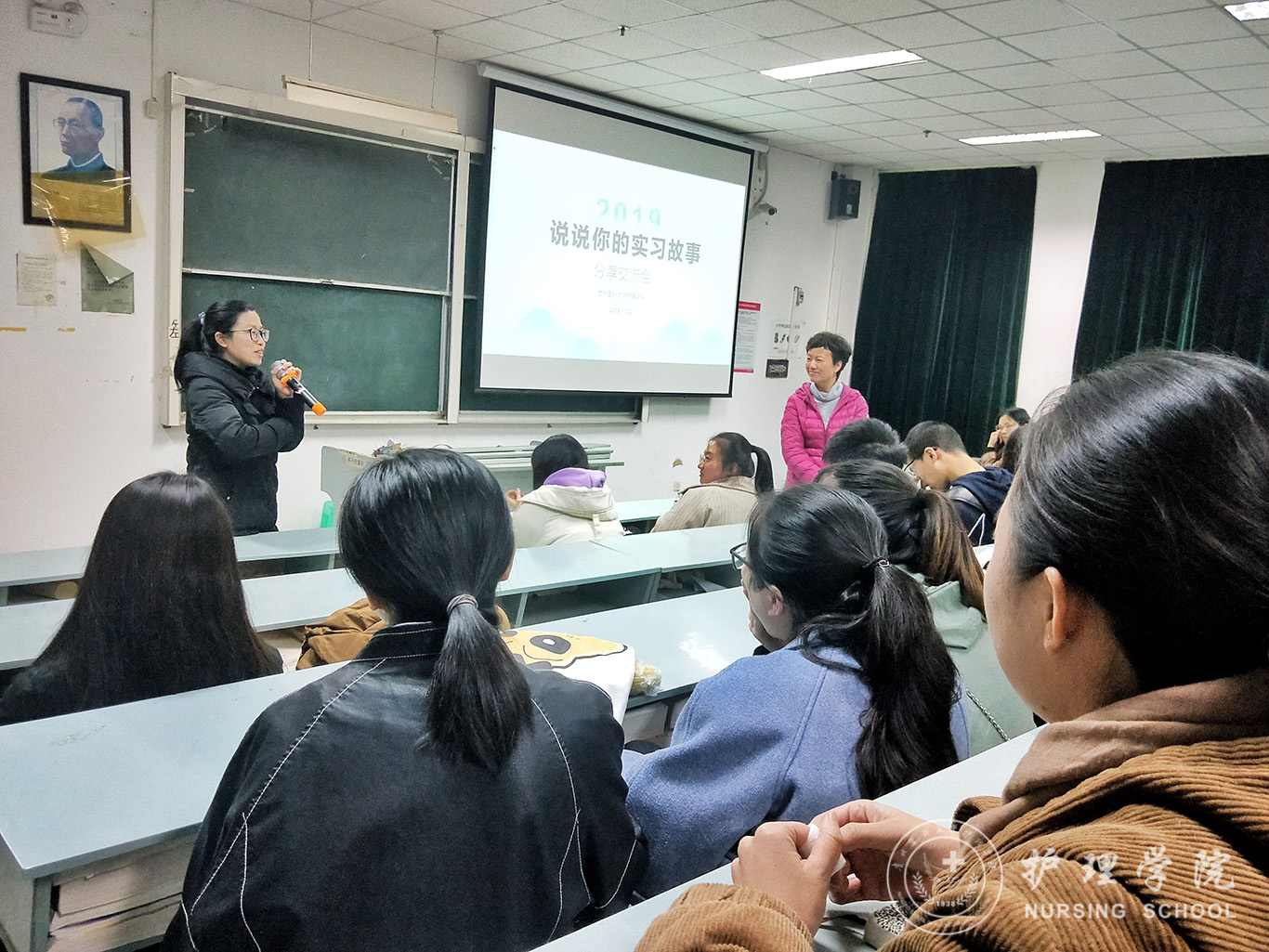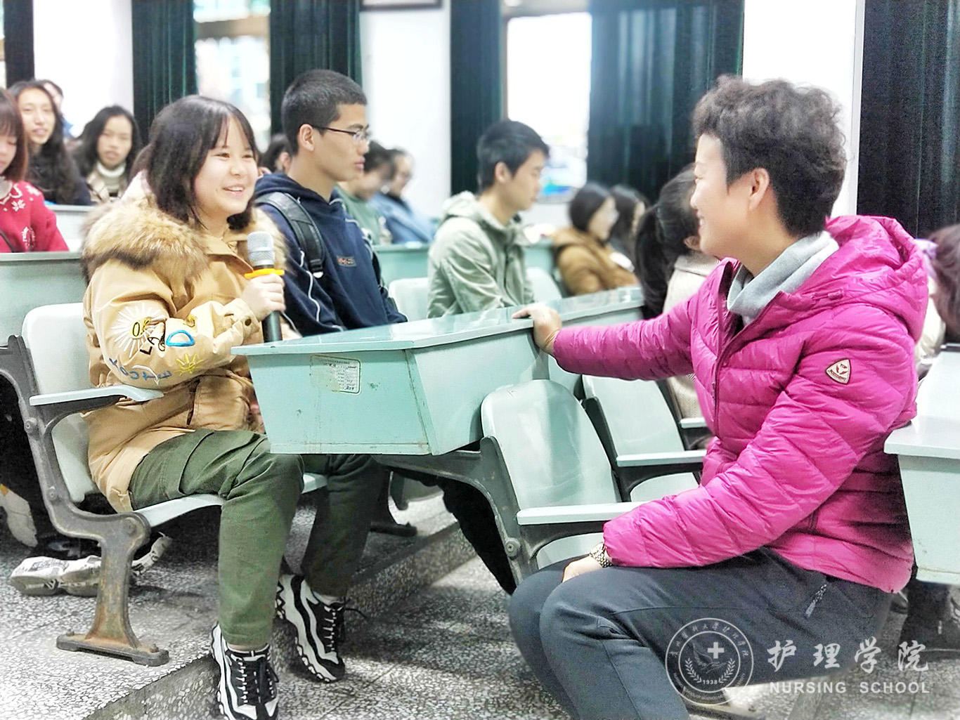 首先,王秀红用亲切平实的语言讲述了自己的实习故事,分享了她在实习中的所见所闻所感,重点讲述了在实习中遭遇逆境时,如何调适情绪,端正实习态度,迎难而上,顺利完成实习工作。此外,王秀红还讲述了自己如何慢慢适应岗位工作,找准定位,最后得到了领导、同事以及病人肯定,成为一名优秀护理工作人员的心路历程。接下来,同学们纷纷倾诉了自己在实习过程中遇到的困惑,毕丽为大家分享了作为患者就医的两次不同体验,让同学们感知站在患者的角度上看待护理工作。在听完同学们的倾诉和毕丽分享后,王秀红从职业特点、情绪调适、自我定位以及责任担当四个方面进行了总结,引导广大实习生树立正确的人生观、价值观,找准自己的角色定位,勇于担当,争做新时代优秀的护理人才。