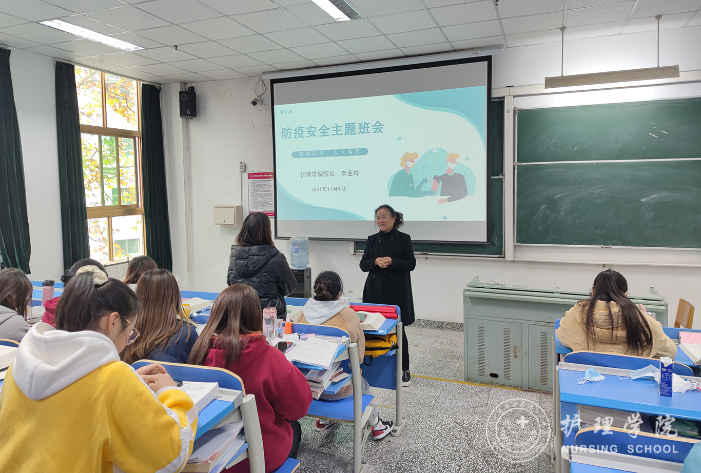 11月9日,为深入开展防疫安全教育,贯彻落实防疫常态化、防护生活化的战略目标。永利集团304官方入口2019级护理学丙班组织开展一次特别的主题班会,诚挚邀请永利集团304官方入口院长李亚玲以“防疫安全、人人有责”为题为全体同学讲授一堂生动有趣的思政课,辅导员杨叶卿参加。