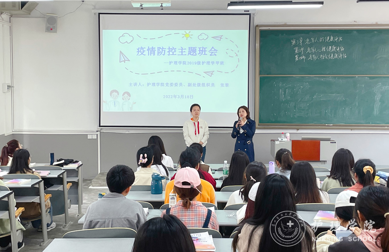 3月18日,因近期疫情反弹,我省遵义市务川县及周边省市连续出现新冠肺炎确诊病例和无症状感染者病例,根据疫情防控工作需要,为了更有效地抗击疫情,增强学生疫情防控意识,有效预防新冠肺炎“卷土重来”,保护好自己和他人身体健康,永利集团304官方入口党委委员、副处级组织员张黎于北校区普教7教室对2019级护理学甲班进行随堂听课并召开“疫情防控”主题班会。班会由辅导员杨叶卿主持,全体同学参加。
