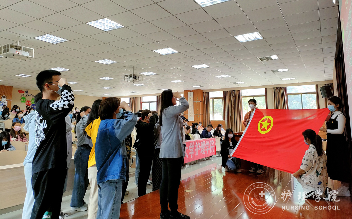 仪式在庄严的国歌声中拉开帷幕,首先由学生管理科副科长毕丽宣读新团员名单,并由参会老师为新团员们佩戴团徽,随后新团员面向团旗进行了入团宣誓。最后,王俊蜻同学代表全体新团员郑重承诺:要继承发扬共青团的优良传统,以团员的标准严格要求自己;不断完善自己,提升思想觉悟,树立崇高的理想,自觉担当尽责,勇做崇德向善、严守纪律、刻苦学习、锐意进取的模范。