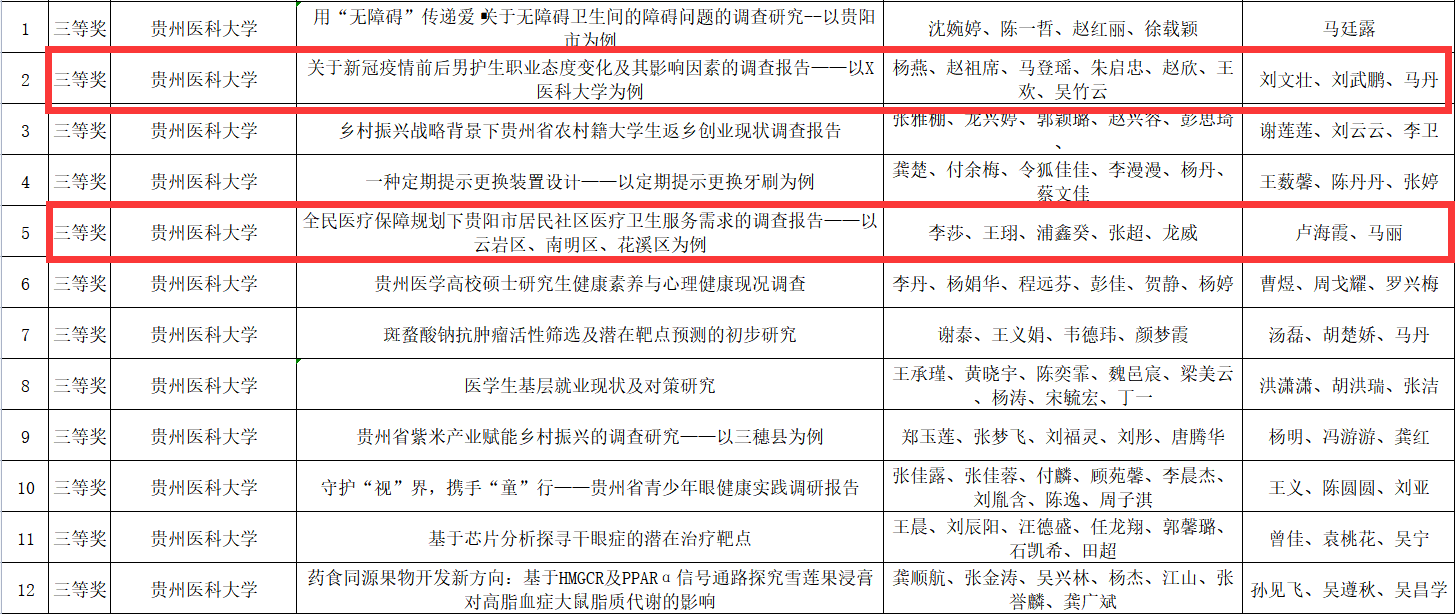 在第十八届“挑战杯”全国大学生课外学术科技竞赛中,永利推出32支队伍参加了校赛,经过层层选拔,在贵州省终审决赛中,由刘文壮、刘武鹏、马丹指导的《关于疫情前后男护生职业态度变化及其影响因素的调查报告——以X医科大学为例》荣获省级三等奖,成员:杨燕、赵祖席、马登瑶、朱启忠、赵欣、王欢、吴竹云;由卢海霞、马丽指导的《全民医疗保障规划下贵阳市居民社区医疗卫生服务需求的调查报告——以云岩区、南明区、花溪区为例》荣获省级三等奖,成员:李莎、王珝、浦鑫癸、张超、龙威。