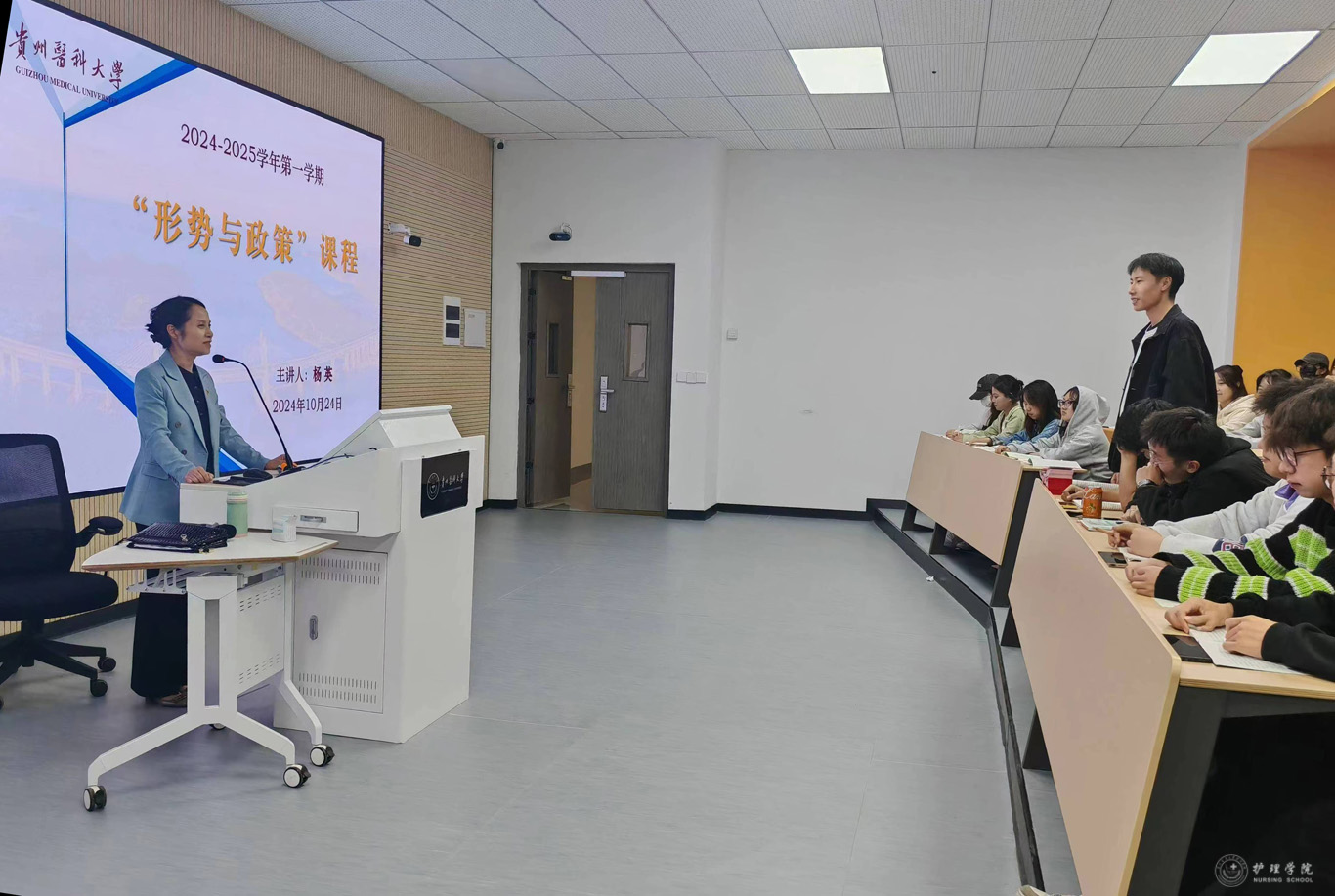 10月24日,为进一步深入学习宣传贯彻党的二十届三中全会精神,进一步加强大学生思想政治教育工作,永利集团304官方入口党委书记杨英、院长李亚玲以“坚定前行谋统一,续写民族新辉煌”为主题,分别在云漫湖校区临床组团R305S、R311S教室通过现场教学及云端课堂直播相结合的方式,为永利集团304官方入口2024级护理学本科生讲授“形势与政策”课。