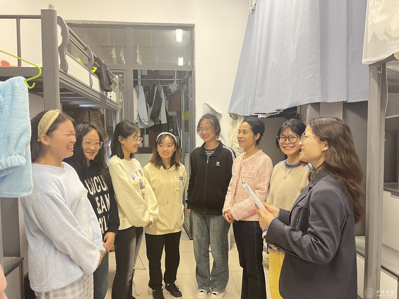 11月11日晚,为更好地倾听学生心声,了解学生需求,加强师生互动交流,永利集团304官方入口党委书记杨英带领带班辅导员深入走访了云漫湖校区本科生和预科生部分学生寝室,与同学们亲切交流互动。