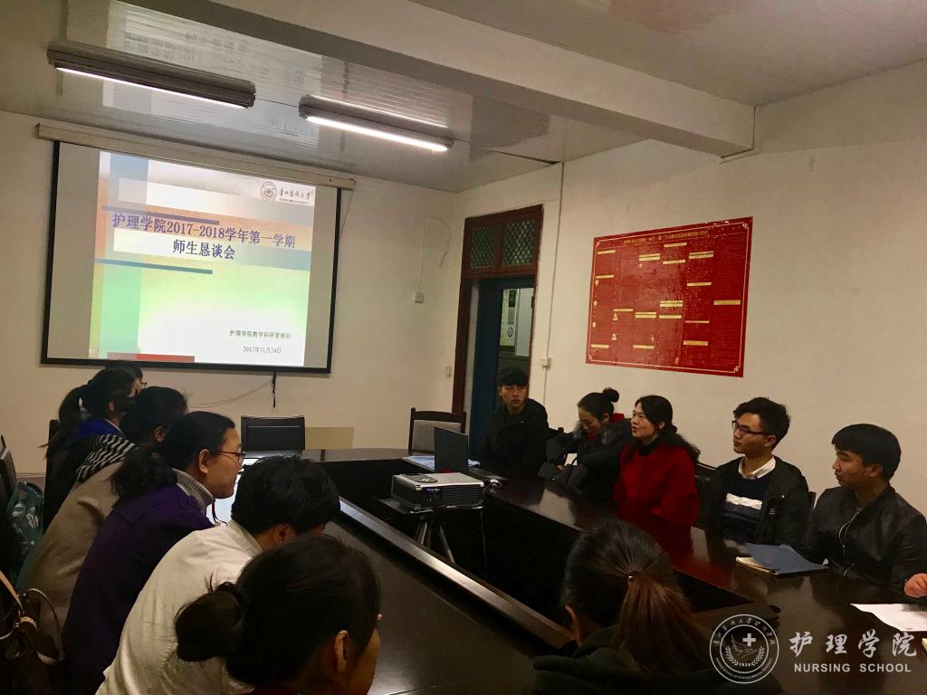 11月24日上午,永利集团304官方入口在北校区第一教学楼二楼会议室召开了2017-2018学年第一学期师生恳谈会。永利集团304官方入口副院长刘志燕、各教研室教师、辅导员、附属医院临床教师及学生代表共计40余人参加了此次恳谈会。