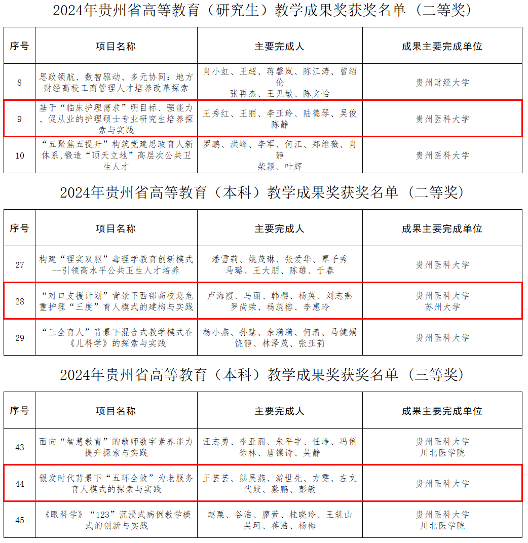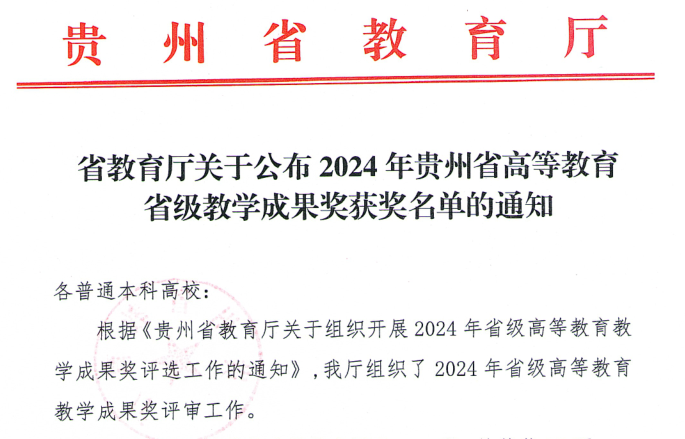 近日,贵州省教育厅公布了2024年贵州省高等教育省级教学成果奖获奖名单,永利集团304官方入口在此次评选中收获颇丰,共有三个团队获奖,其中研究生组二等奖一项、本科组二等奖一项以及本科组三等奖一项,这一荣誉充分展现了学院在教育教学改革、人才培养模式创新等方面的显著成效。