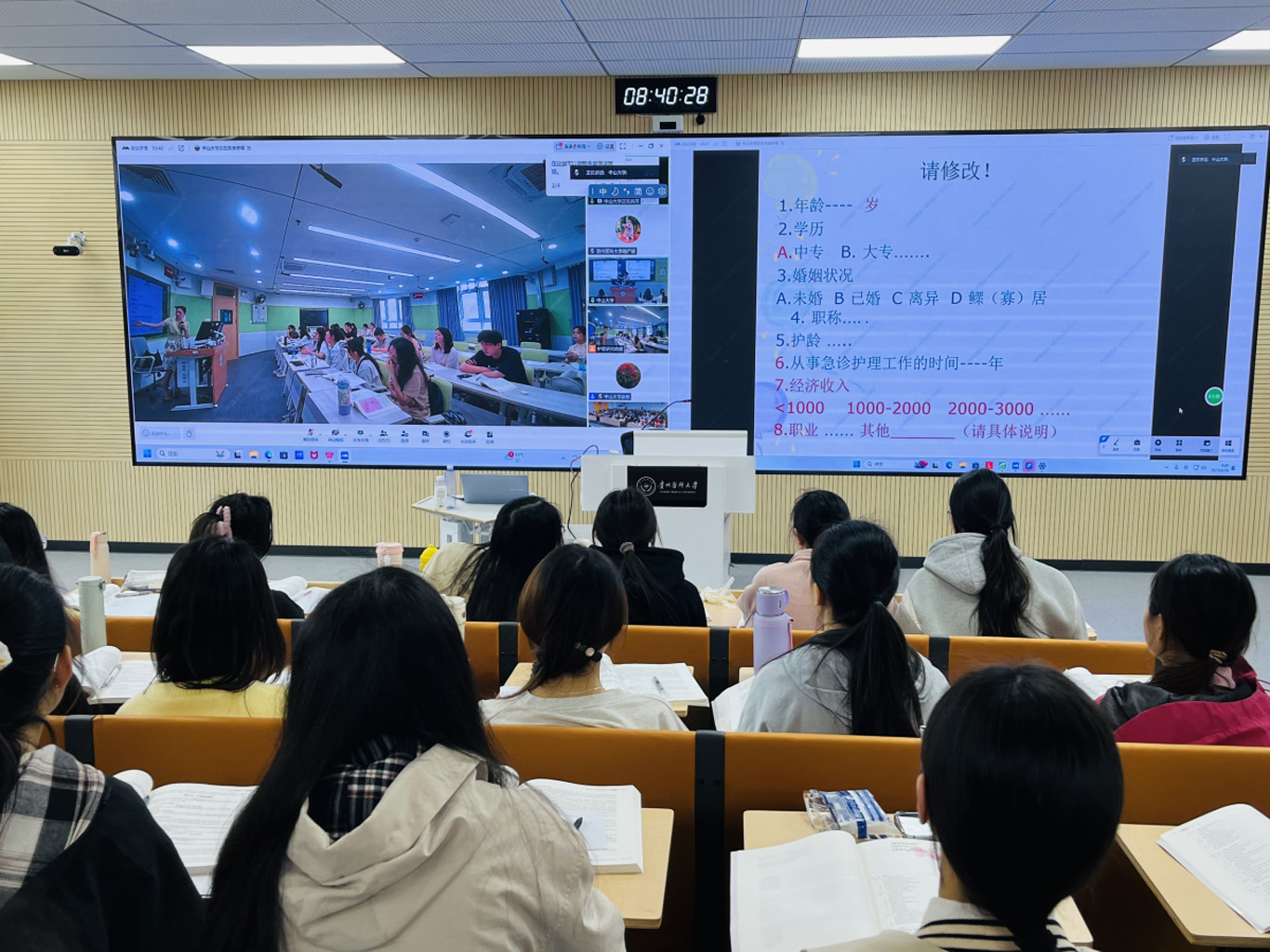 此次活动中中山大学张美芬教授、刘可副教授、张利峰副教授分别就“护理研究选题”“资料收集法”“研究报告的书写”,同步为中山大学永利集团304官方入口2023级22名同学和永利集团304官方入口2022级152名进行授课。304永利集团登录入口护理学基础教研室副主任邹惠美及护理学研究教学团队教师冯安丽、卓英权老师作为主要参与教师共同协助同步课堂的开展。