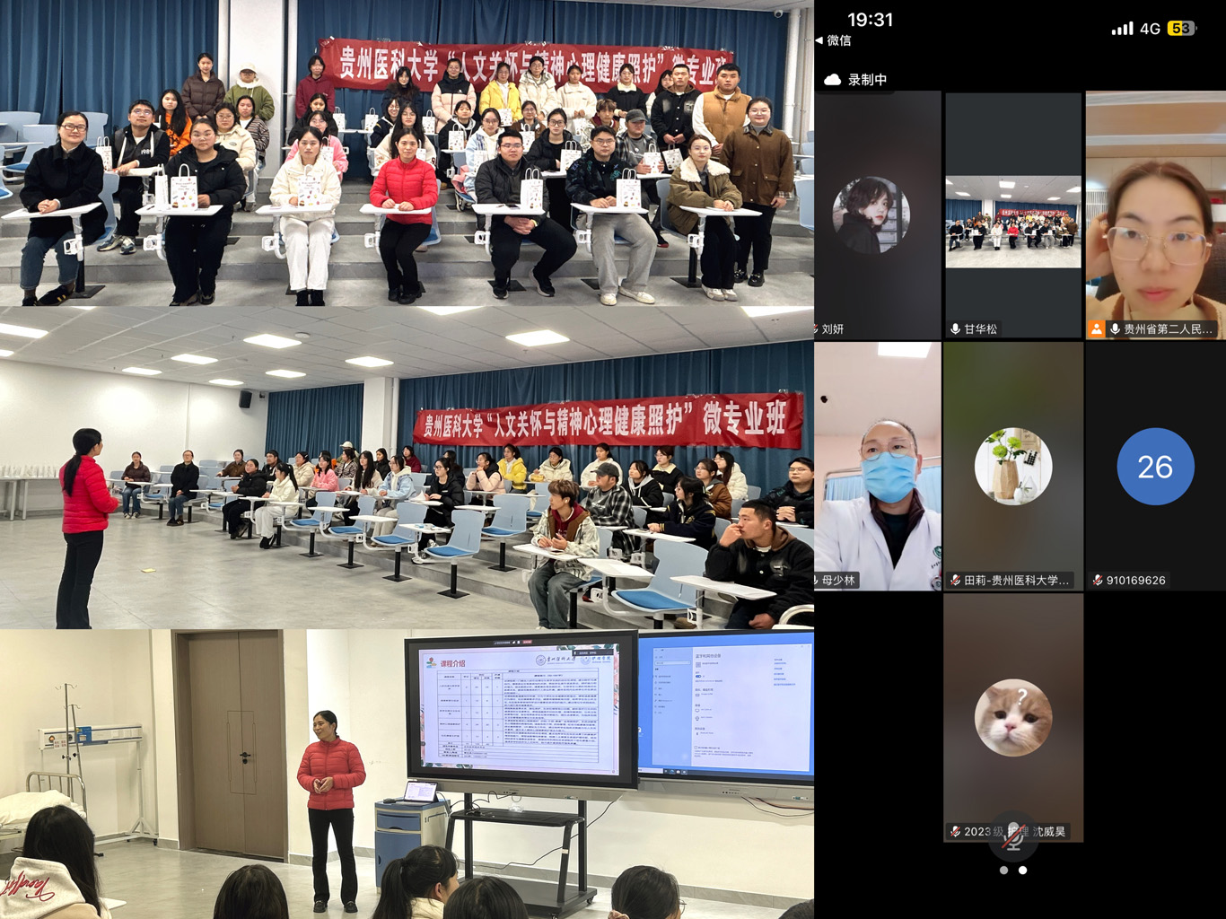 为积极响应国家加强精神卫生服务体系建设的号召,适应新时代精神健康服务需求,培养兼具专业技能与人文关怀素养的健康照护人才,304永利集团登录入口开设的“人文关怀与精神心理健康照护”微专业于11月3日在云漫湖校区临床组团酬勤楼示教室举行了开课仪式。开课仪式采用线上线下相结合的方式进行。护理人文教研室主任张仁莉,教师李红、刘妍以及304永利集团登录入口附属医院心理精神科护士长田莉、精神专科护士母少林和甘华松、贵州省第二人民医院康复科主任刘义、课程秘书覃启柔等微专业团队老师以及32名微专业学员共同参与。