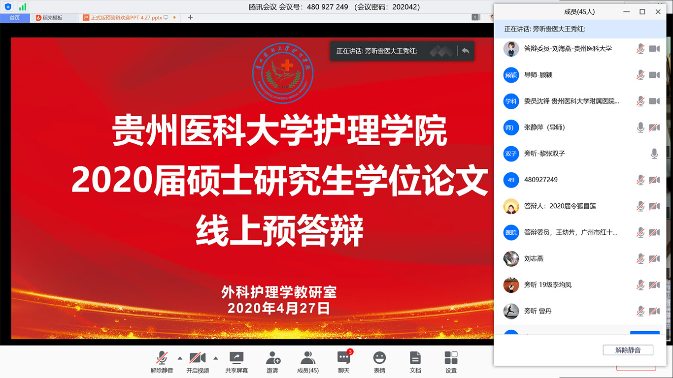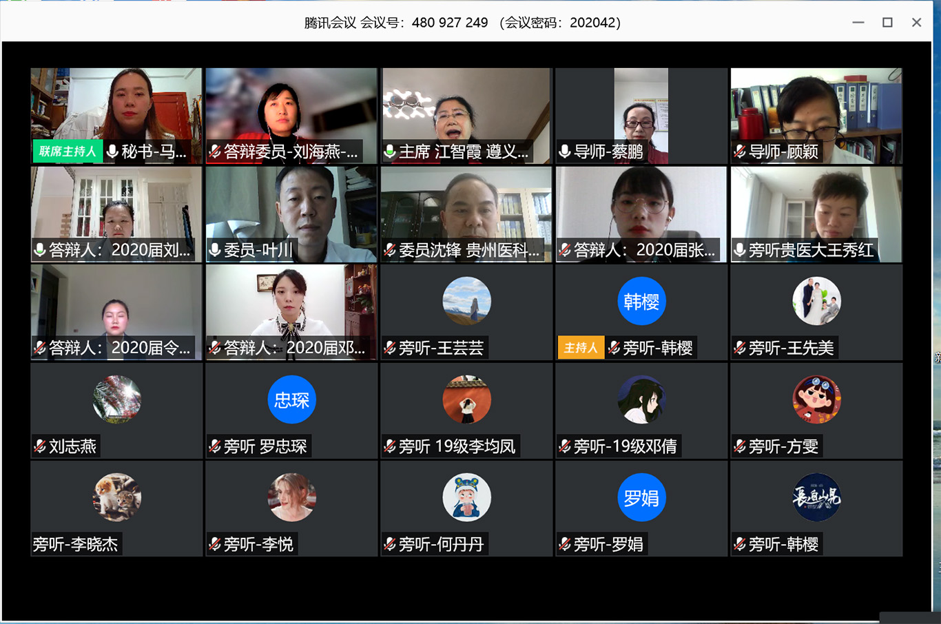 此次线上预答辩采用腾讯会议平台,8名毕业班研究生同学按研究方向分成两组进行。答辩委员会主席和委员分别由贵州中医药大学永利集团304官方入口党委书记石国凤教授、遵义医科大学永利集团304官方入口院长江智霞教授、贵州省人民医院柏晓玲博士、304永利集团登录入口附属医院ICU主任沈锋博士、骨科博士后叶川教授、老年医学科教授莫显刚博士、广州红十字会医院王幼芳副主任护师、304永利集团登录入口公共卫生学院王子云博士、刘海燕副教授、304永利集团登录入口基础医学院许健炜博士担任。两场预答辩共有近100人参加,学校研究生教育督导专家、永利集团304官方入口及附院导师、专业教师和全体研究生同学参加预答辩旁听。