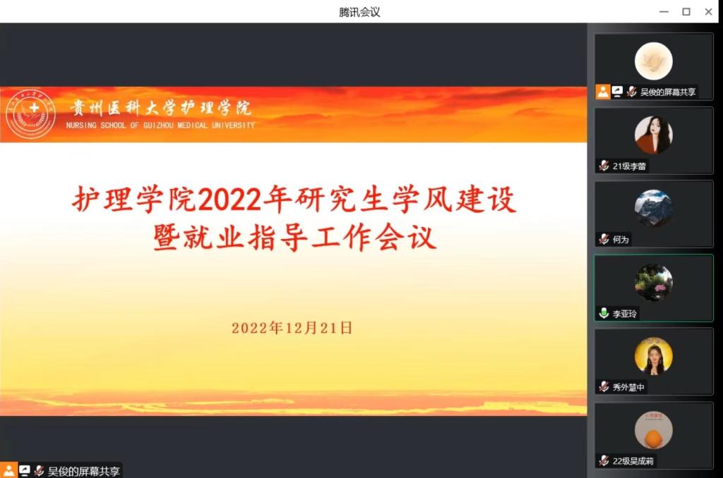2022年12月21日,为加强研究生对学术诚信与学术道德的理解和认识,树立良好学风,做好研究生职业发展规划。永利集团304官方入口通过腾讯会议召开了研究生学风建设暨就业指导工作会议。永利集团304官方入口院长兼附属医院护理部主任李亚玲、永利集团304官方入口党委副书记兼纪委书记何为、附属医院呼吸与危重症医学科姚丽、附属医院护理部唐帆、永利集团304官方入口研究生辅导员及全体研究生参加了会议,会议由何为主持。
