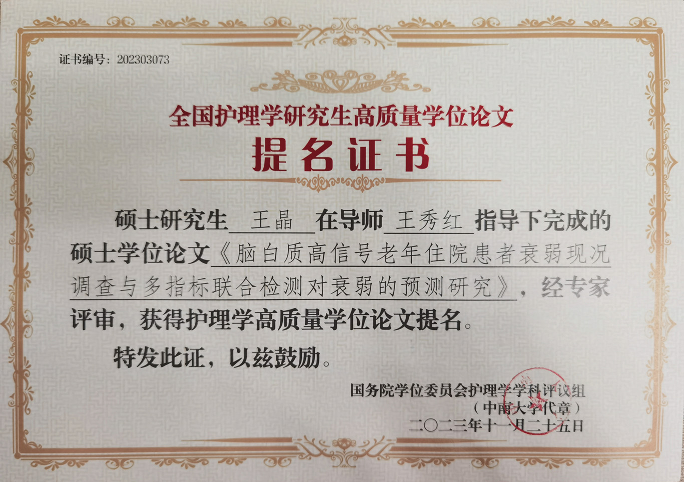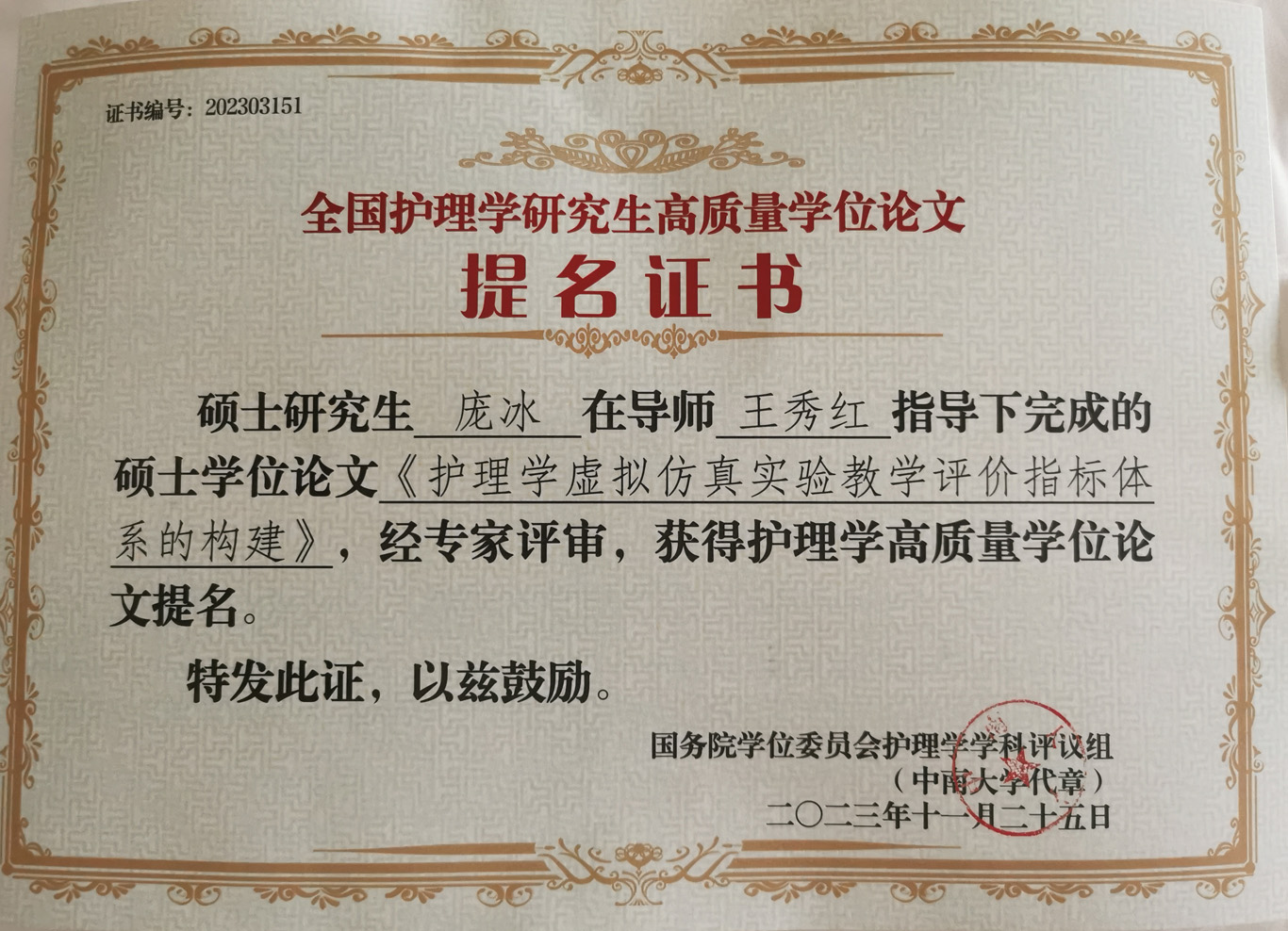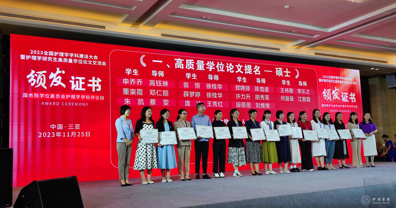 会议公布了前期由教育部护理学学科评议组开展的“高质量学位论文评选工作”情况及结果。来自全国70余所院校、2020届到2023届232篇博士硕士优秀论文进入评选目录。由研究生导师王秀红指导的永利集团304官方入口2021届护理学学硕研究生王晶、2023届护理学学硕研究生庞冰的学位论文获评高质量学位论文提名奖。