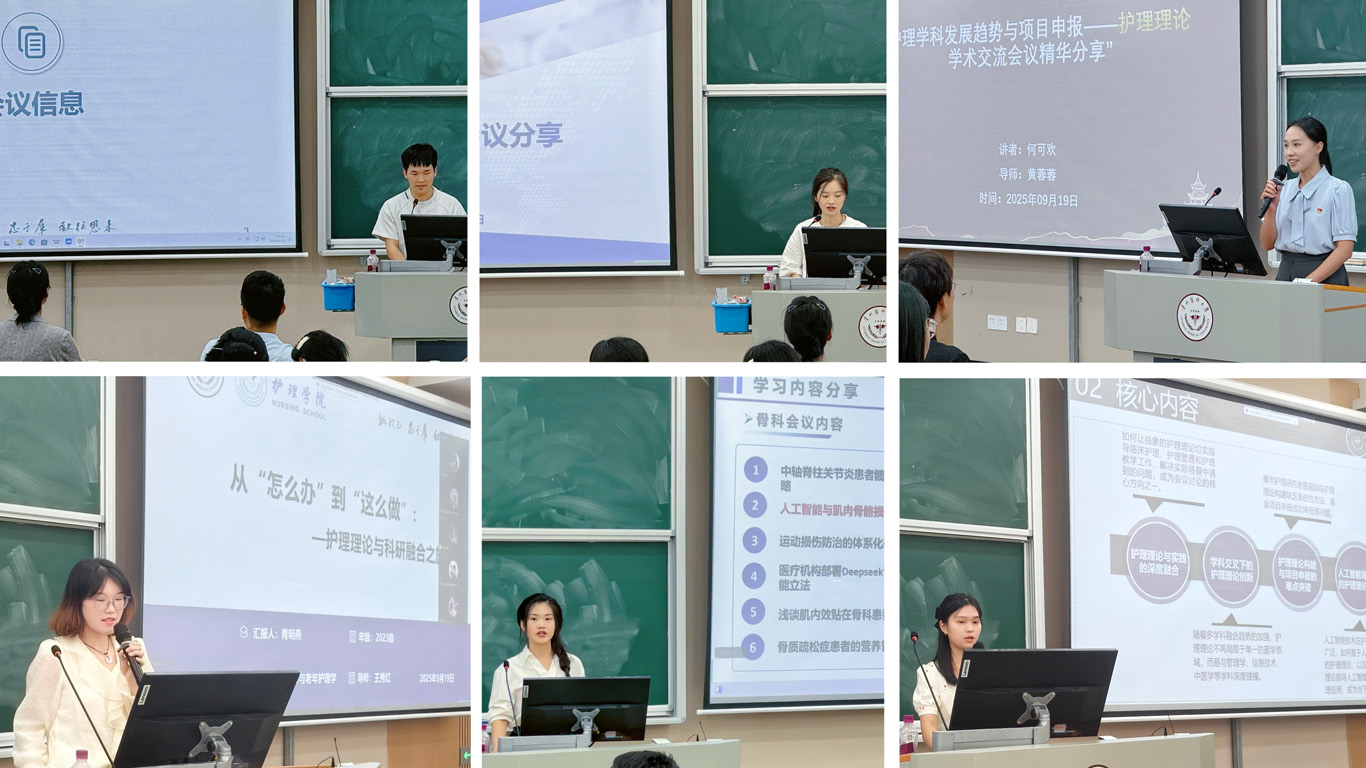 会议过程中,2023级学硕研究生青明燕分享“理论—方法—实践”三位一体模式,阐释护理理论价值并提出分类适配与文献分析策略;2023级专硕研究生王露结合乳腺癌量表案例介绍“理论框架九步法”,强调理论适配与温度把握;2024级学硕研究生何可欢转述专家对护理发展趋势、选题方向及破局之道的解读,并分享需求层次理论与人文关怀的思考;2023级学硕研究生陆珍梅介绍理论新进展与本土化研究,结合经验解读投稿流程与AI助力选题,强调理论与研究契合;2023级专硕研究生李鸿运聚焦骨科护理,分享3D打印、AI康复、MDT管理及软骨再生研究;2024级专硕研究生邓秀平解读骨科AI康复、脑脊液渗漏护理共识,介绍Orem自理理论、变革理论及潜在类别分析方法,并结合发言经历谈成长。卓英权在交流答疑中提到此次会议涵盖多个前沿领域,其中骨科专业讲座内容扎实,系统梳理并更新了从基础理论到临床实践的知识;他认为此类会议对教师专业成长和教学内容更新至关重要,同时他指出持续学习的必要性,建议学生在汇报中融入会议所学先进理念与技术。殷艳温馨提示:一是注重学术传承,参会同学要将收获分享给未能参会者,以点带面、共同进步;二是时刻警惕、确保安全,珍惜机会、心怀感恩。