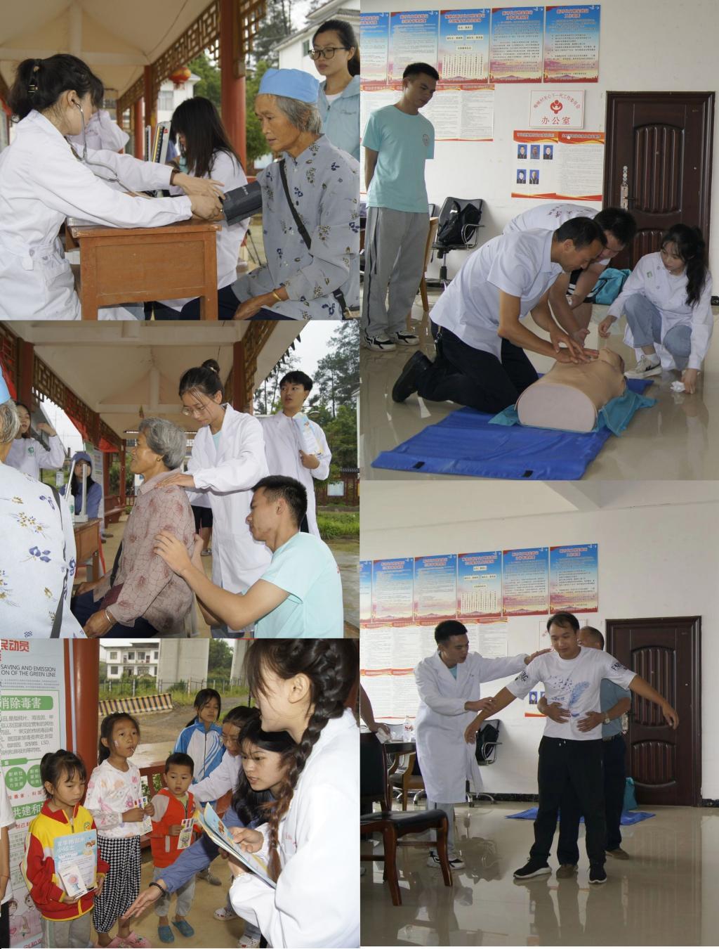 在村委会的大力支持和组织下,服务队在梅桃村开展义诊和海姆立克急救法宣讲活动。活动中,服务队悉心为村民测量血压,给予了相应的建议,用自己的专业知识为他们答疑解惑。队员们一边陪来访的老人聊天,一边用娴熟的手法帮老人们按摩肩颈部,现场充满欢声笑语。