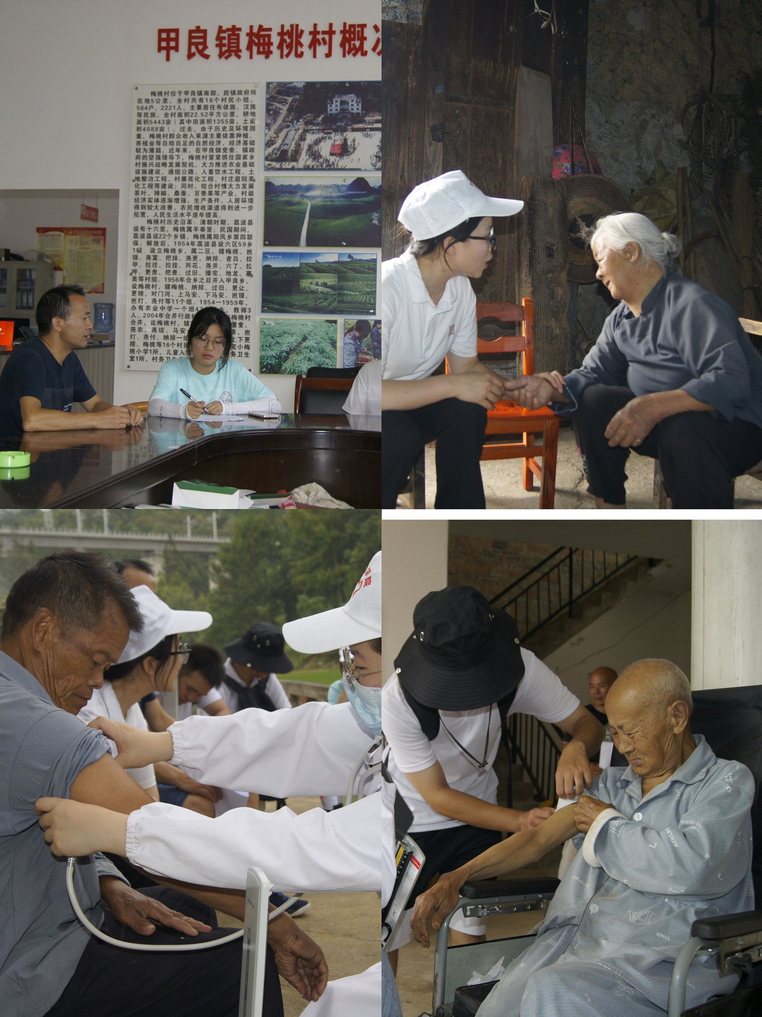 到达梅桃村当天,服务队就先后探访了独居老人、退伍老人和空巢老人,分别赠送了大米和牛奶,期间,队员们细心为其测量血压并给出相应的护理建议,在与老人们聊家常的过程中,详细了解了当地居民生活和就医现状。