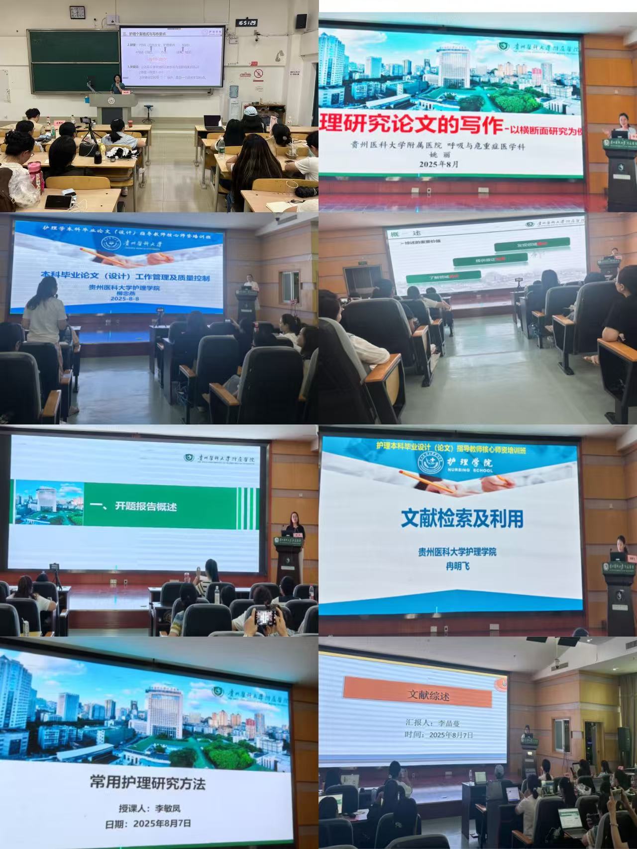 本次培训采用理论授课与工作坊相结合的模式,来自学院和附属医院的护理科研师资担任授课。培训内容涵盖护理研究概述、护理科研伦理、护理科研选题、开题报告的撰写、护理研究论文的写作等。同时解读了教育部及贵州省教育厅关于本科毕业论文抽检的相关政策、永利集团304官方入口本科毕业论文的实施细则,对论文指导工作流程管理及学术规范等核心环节进行了深入阐释和重点强调。在工作坊环节,通过以情景问题为导向的文献检索实操、学生综述示例及实习医院教师代表开题汇报来引导学员们如何通过科研方法来解决实际临床问题并规范撰写报告。