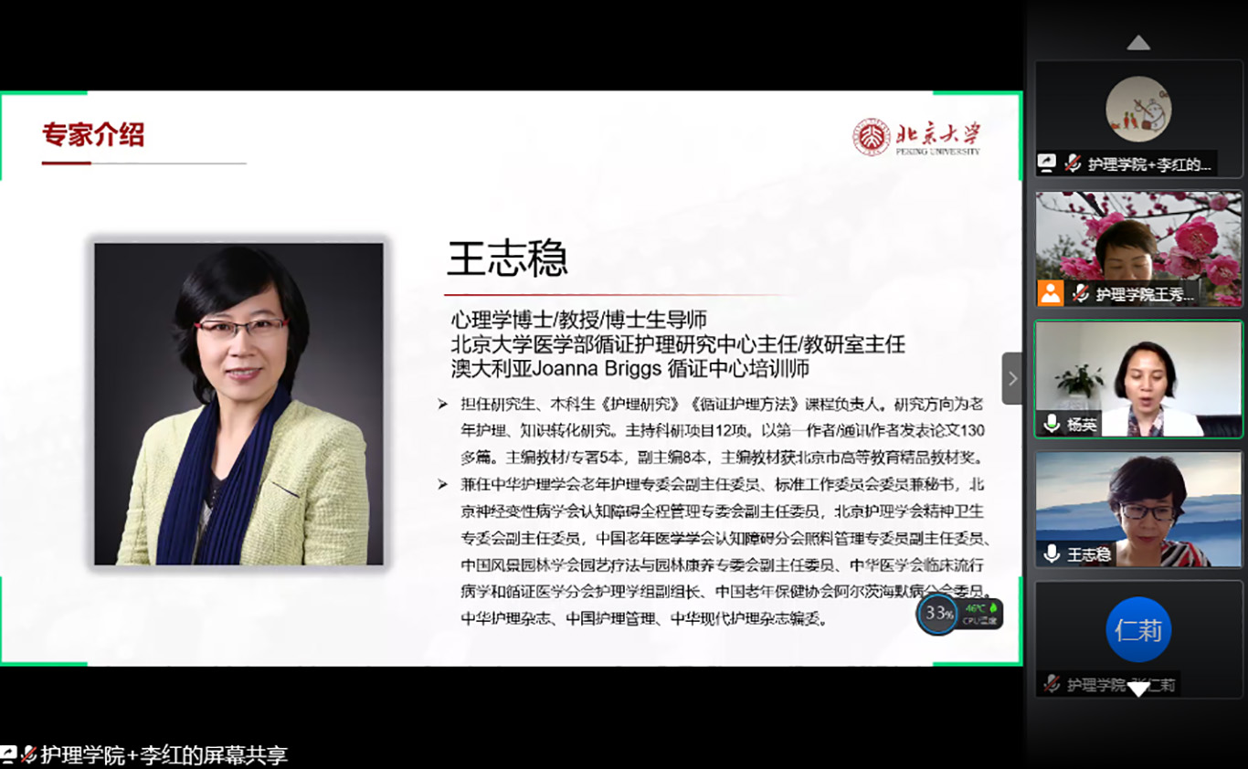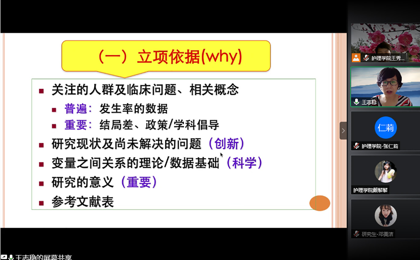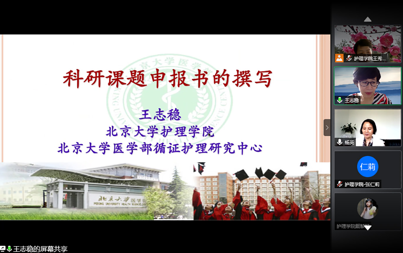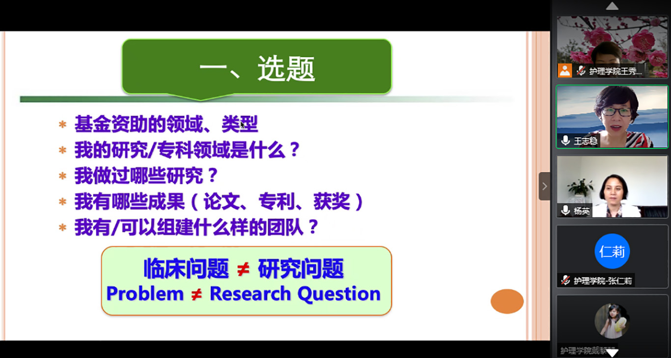 为进一步提升我校护理学科科学(教学)研究水平,加强护理学科内涵建设,促进护理学科科研(教学)团队的建设,培育新型护理学术(专业)人才,推动我校护理学科及各附属医院护理科研(教研)的总体发展。6月24日下午,北京大学永利集团304官方入口博士生导师、循证护理研究中心主任王志稳教授受邀为我校护理教师及研究生开展了题为“护理科(教)研申报书撰写”的专题讲座。会议通过腾讯会议平台进行,永利集团304官方入口及附属医院、第二附属医院、第三附属医院、附属白云医院等直属附属医院部分教师和研究生近100人参加了讲座,永利集团304官方入口党委书记杨英主持会议。