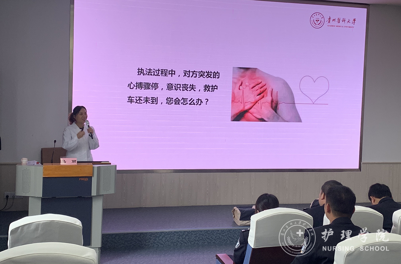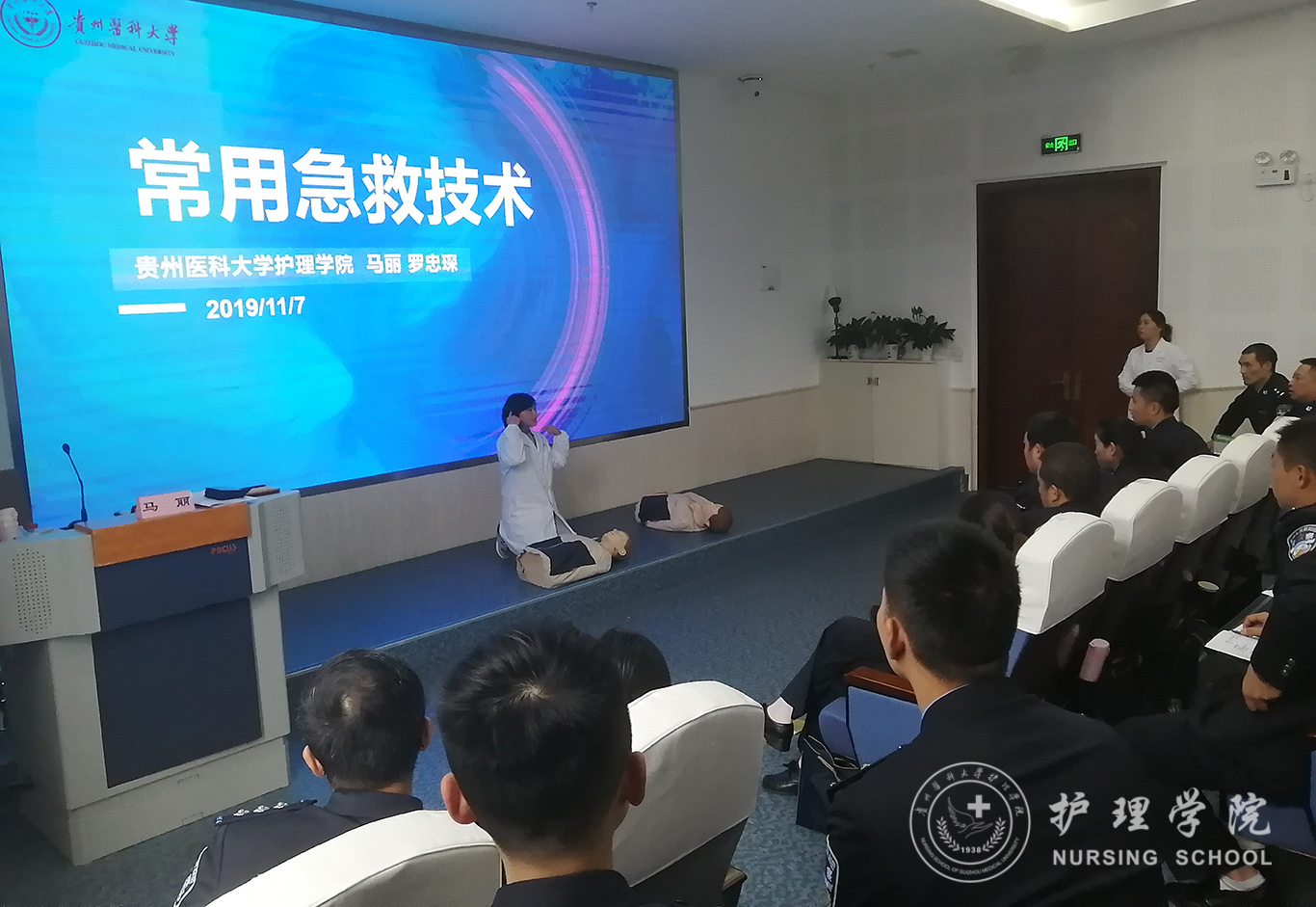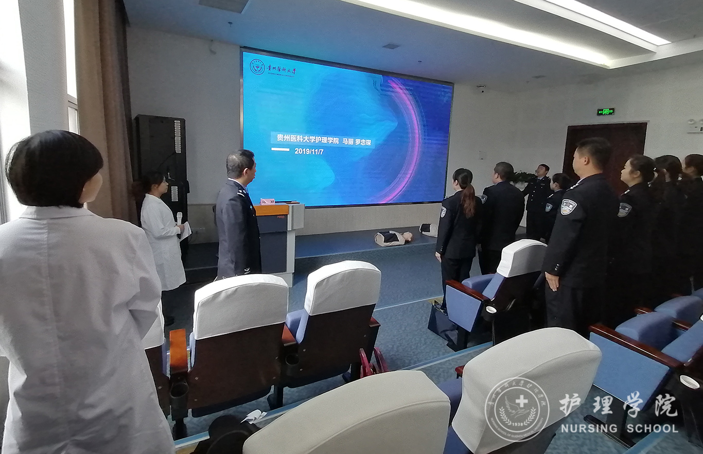 受贵州省人民检察院法警总队邀请,中国南丁格尔志愿护理服务队304永利集团登录入口分队志愿者、永利集团304官方入口外科护理学教研室教师马丽和罗忠琛于11月7日到观山湖区国家检察官学院贵州分院为“2019年贵州省检察机关新入警及晋升警衔司法警察培训班暨支队长硏讨班”授课,培训学员共55人,培训内容为常用急救技术。