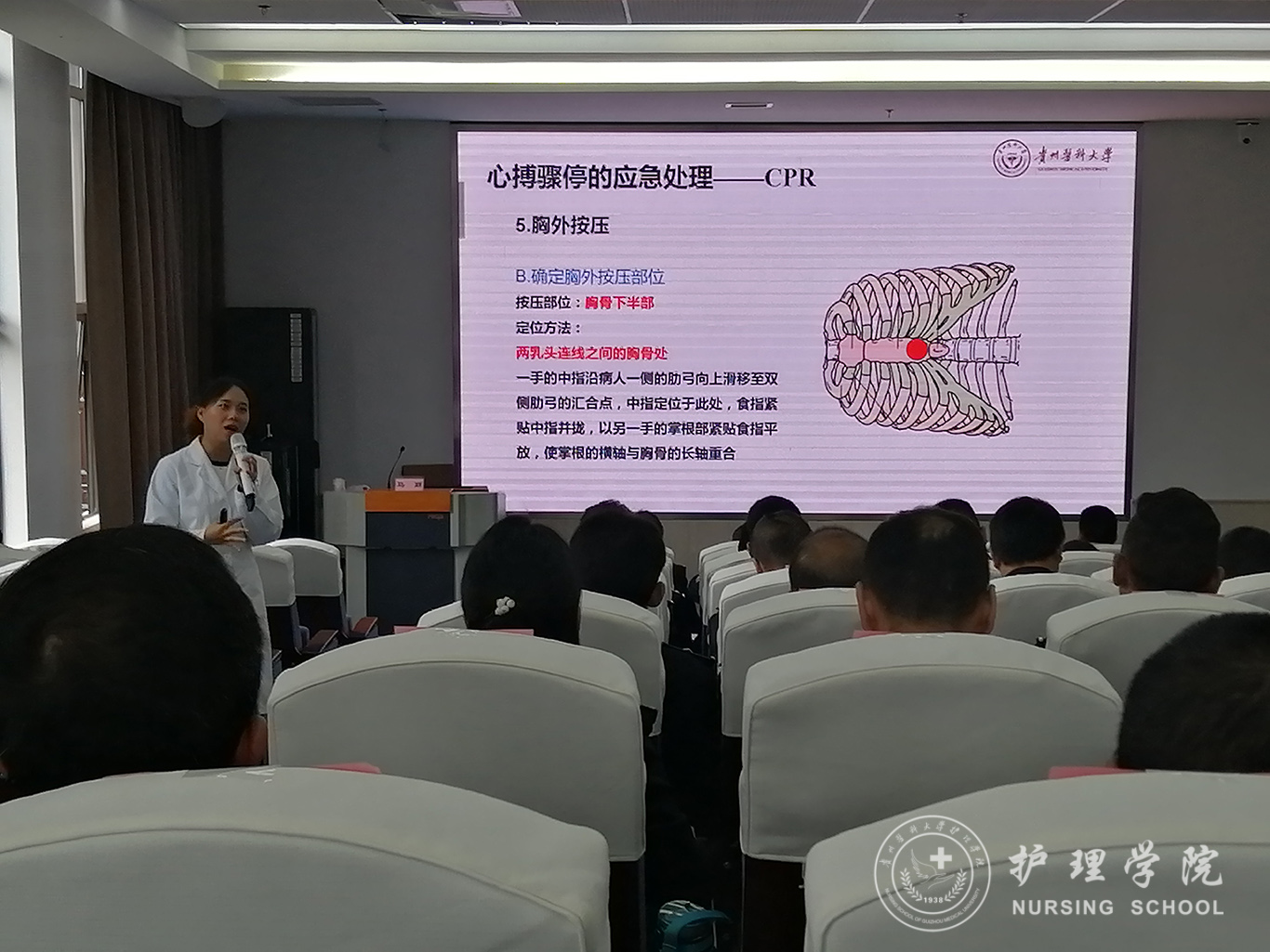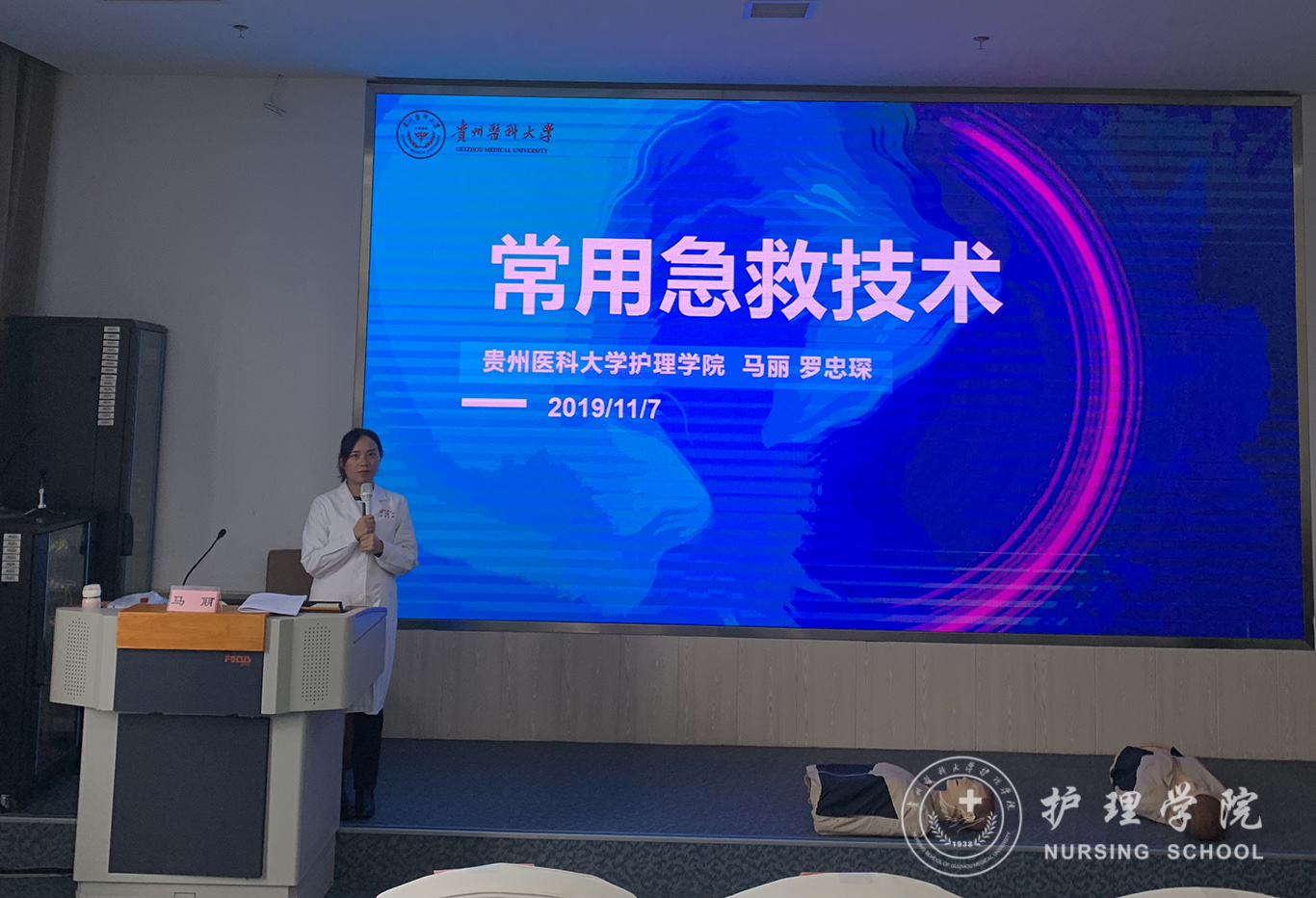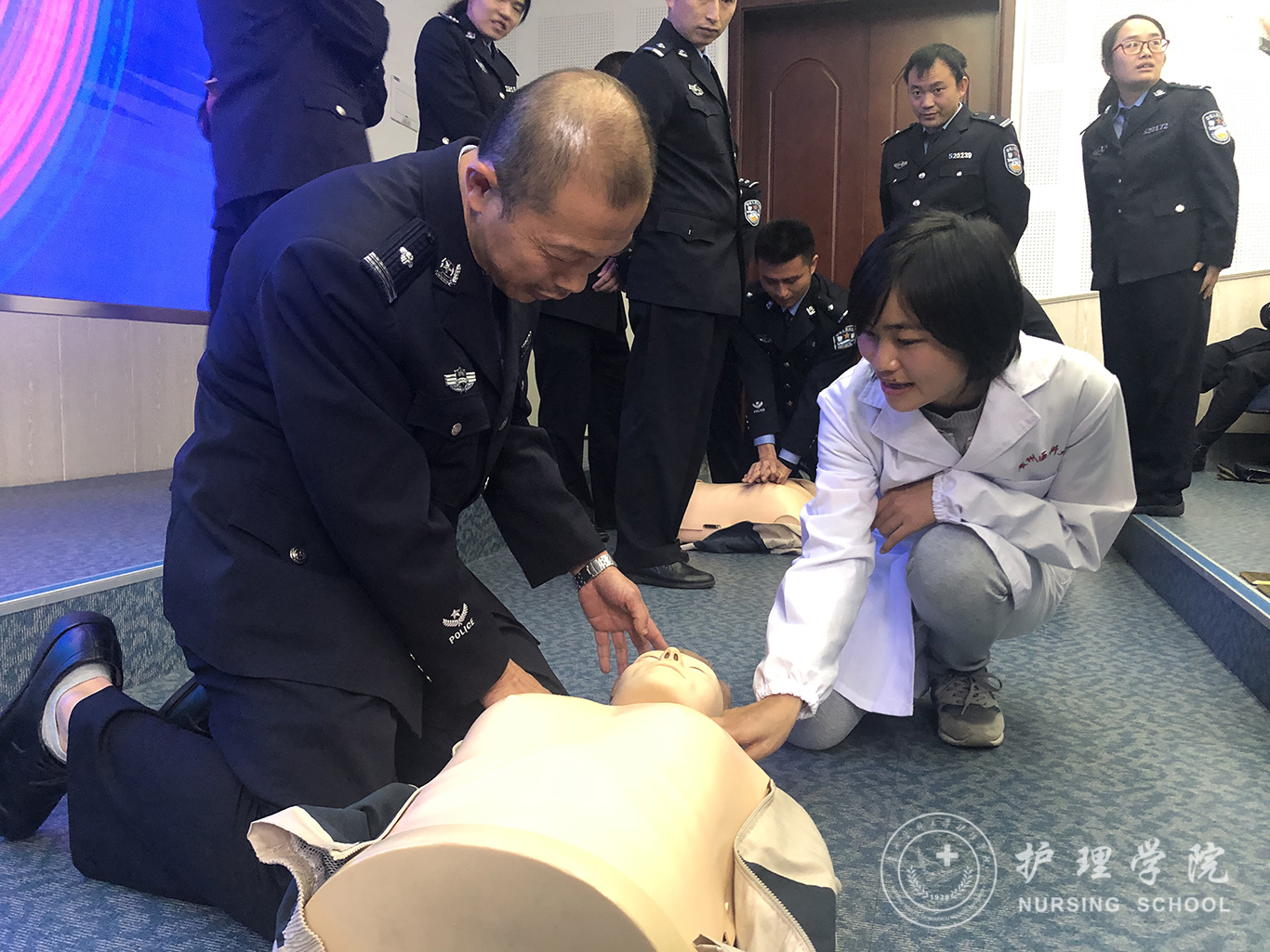 受贵州省人民检察院法警总队邀请,中国南丁格尔志愿护理服务队304永利集团登录入口分队志愿者、永利集团304官方入口外科护理学教研室教师马丽和罗忠琛于11月7日到观山湖区国家检察官学院贵州分院为“2019年贵州省检察机关新入警及晋升警衔司法警察培训班暨支队长硏讨班”授课,培训学员共55人,培训内容为常用急救技术。