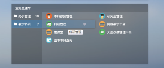 第一步:进入oa系统,业务直通车,点击教学科研中“科研管理”(也可通过304永利集团登录入口科学技术网站链接进入科研管理系统,账号密码如未修改,都默认为职工号或是身份证号后六位)