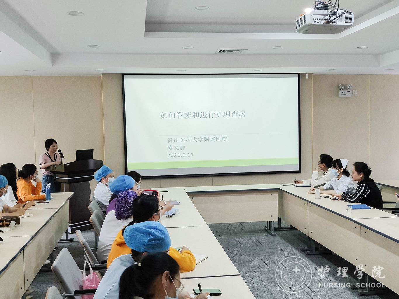 接下来,附属医院护理部办公室副主任凌文静以《如何管床和护理查房》为题,从患者入院护理评估、护理诊断、护理目标、护理措施、护理病程记录及护理效果评价六方面进行详细的讲解。指出:对患者进行护理评估时,除了解基本情况外,还应全面掌握其治疗经过、辅助检查情况、主要症状和体征等,从而提出患者的主要护理问题。强调护理诊断应遵循“先现存、后可能,先重要、后次要,先原发、后继发”的原则,做到定期评估,实时更新。同时对主要护理问题制定全面、系统、整体的护理措施,适时进行调整,并建议临床科室加强研究生分管病人的落实,让研究生真正参与到患者入院-出院全程护理、医护联合查房中去,以此强化学生临床思维能力和实践操作技能。
