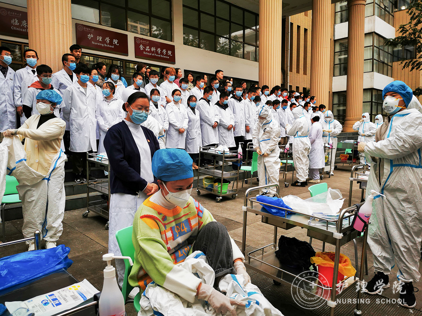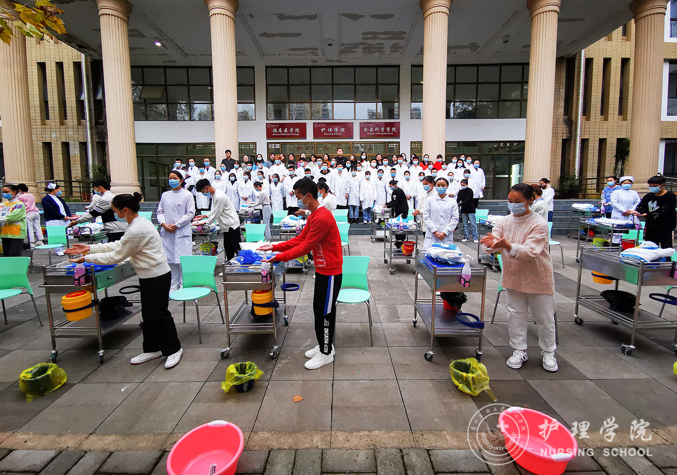 百川楼1楼小操场上,整齐摆放着30台治疗车,学生教练员早已准备就绪,随着老师一声令下,学生教练员开始现场演示如何正确穿脱防护服,他们个个认真、细心、严谨,展示了娴熟的操作技能。穿脱防护服演示结束后,永利基础护理学教研室的资深教师、学生最喜爱的肖霓老师,在百川楼三楼永利集团304官方入口示教室为协和班的同学进行了一场无菌操作示教活动,本次示教活动采取理论和实践相结合,生动形象的将无菌操作技术展现在同学们眼前,同学们均表示收获满满。最后,在获得防疫相关理论知识的基础上,永利集团304官方入口的30名学生教练员在模拟实验室开始对协和班的同学就如何正确穿脱防护服和采取咽拭子进行“一对一”指导和考核。