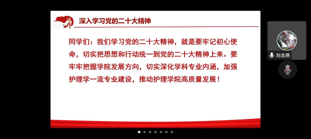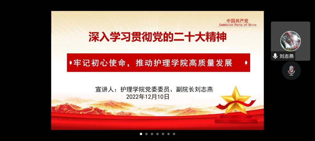 12月10日,为全面深入学习贯彻党的二十大精神,进一步掀起学习宣传贯彻党的二十大精神热潮,引导学生党员把思想和行动统一到党的二十大精神上来,永利集团304官方入口党委委员、副院长刘志燕以“牢记初心使命,推动永利集团304官方入口高质量发展”为题在永利集团304官方入口学生第二党支部给全体党员作了党的二十大精神专题宣讲。会议由支部书记刘文壮主持,支部全体党员通过腾讯会议参加本次宣讲会。
