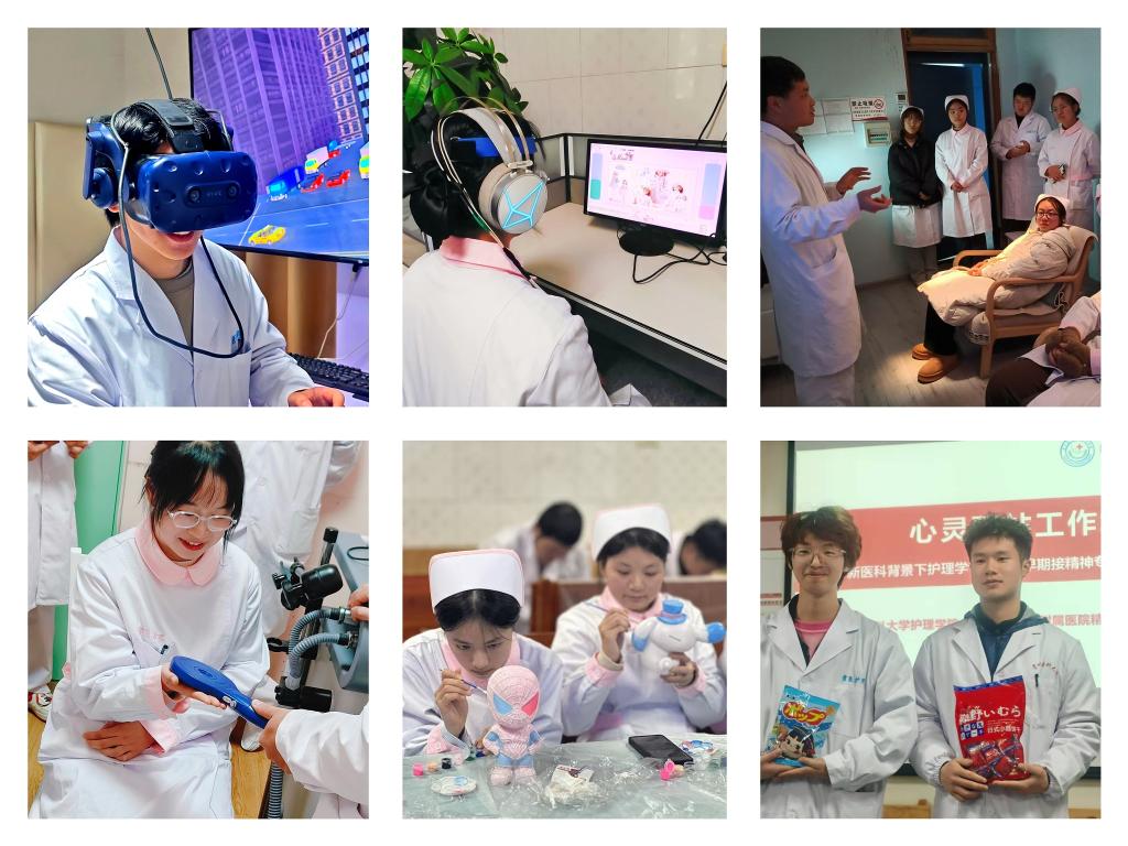 在实践体验环节,学生们观摩了医护人员与精神疾病患者及家属的沟通技巧,并在老师的指导下对新入院患者进行了自杀、自伤、暴力等风险评估。老师们通过模拟“标准化病人”的方式,向学生生动展示了噎食、冲动患者应急预案演练全过程。学生们初步了解了突发事件处置流程,学会了精神科保护性约束操作及相关注意事项。此外,学生们还亲身体验了光照疗法、脑电生物反馈、经颅磁刺激、有氧运动、VR治疗、工娱治疗等专科康复治疗手段,并通过心灵驿站工作坊增强了学生对精神健康问题的认识和关注。