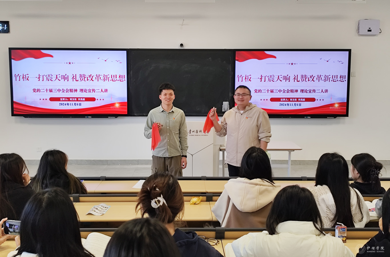 “竹板这么一打呀,别的咱不夸,夸一夸党的二十届三中全会精神顶呱呱!”两位宣讲员模仿起说书人的口吻,快板声起,言辞犀利,朗朗上口。他们边打快板边宣讲,将全会精神的核心内容融入其中,强调改革的决心和成效,突出教育改革的实际,赢得了在场学生的阵阵掌声。